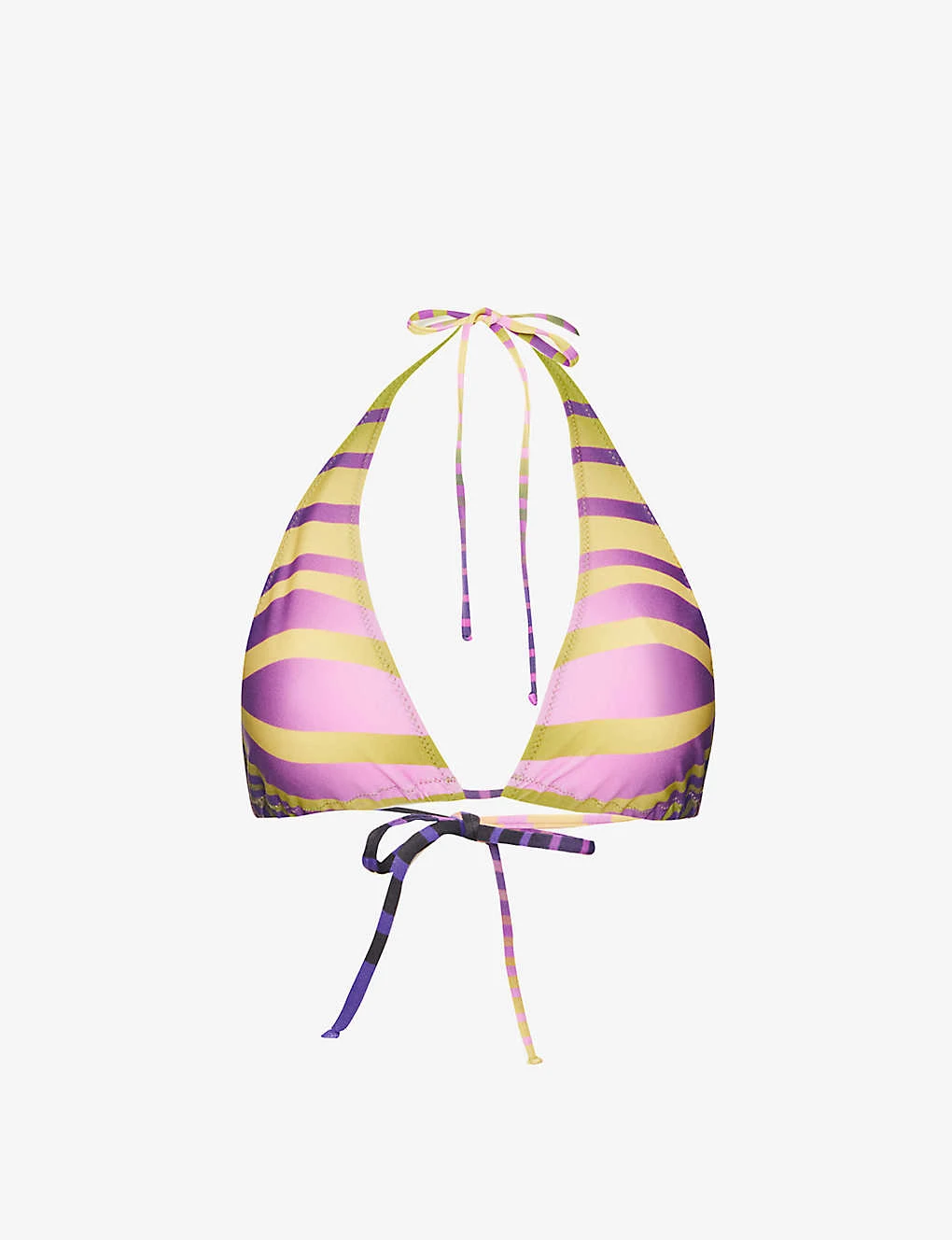 - Halter-neck, triangle cups, all-over print, lined