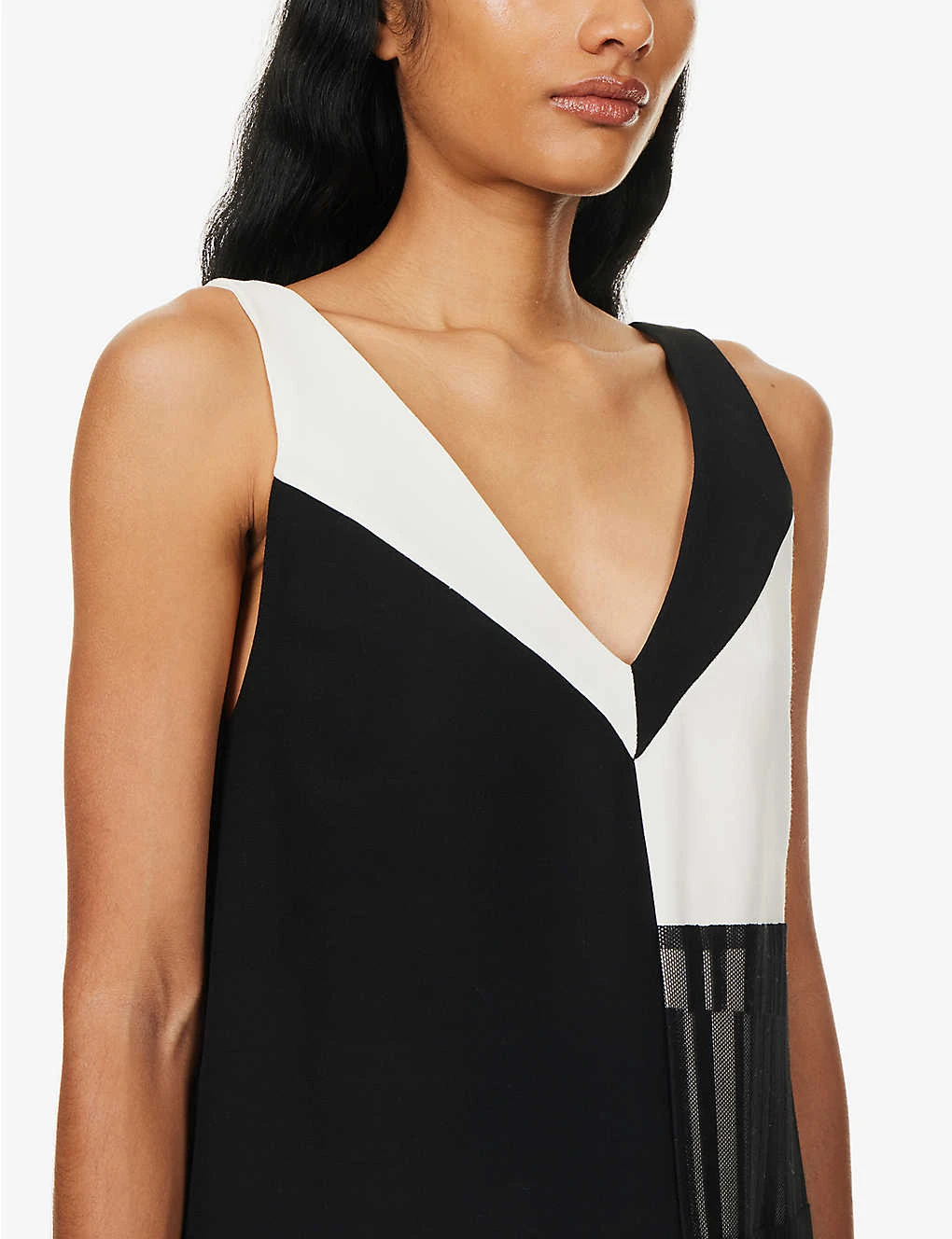 - Regular fit, V-neckline, sleeveless, all-over panelled block pattern, sheer hem panel