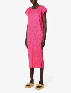 - Relaxed fit, round neckline, short sleeves, two slip pockets at front, all-over textured pleat pattern, split hem