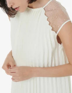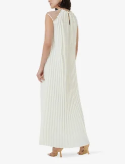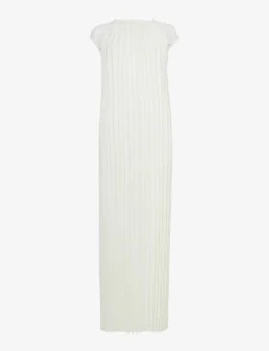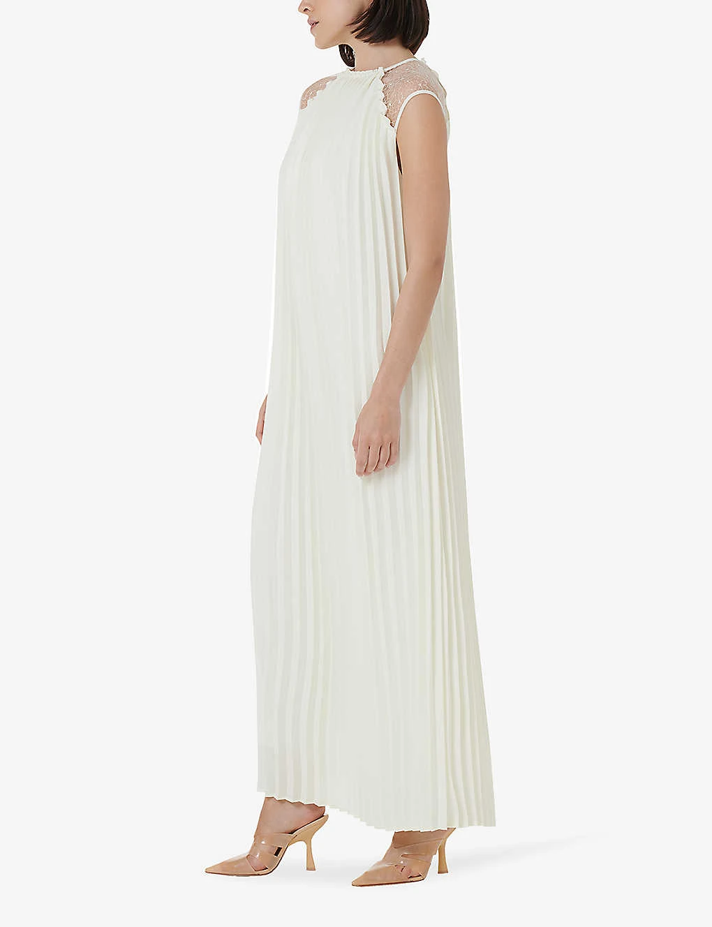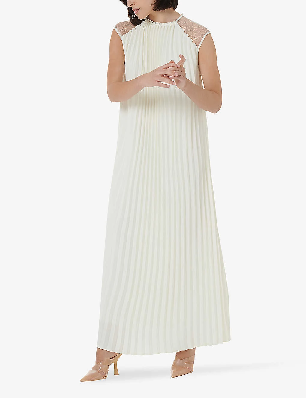 - Round neck, sleeveless, lace-trim at the shoulder, all-over pleat detail, maxi length