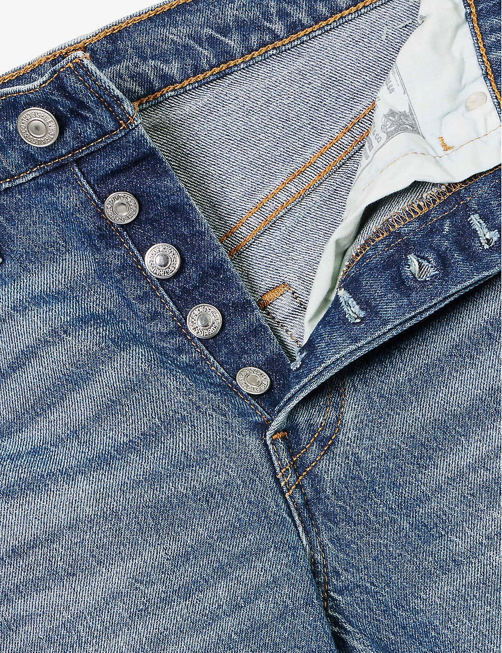 - Regular fit, high-rise, straight leg, belt loops, five pockets, brand patch and brand tab at back, faded wash and whiskering, straight cuffs