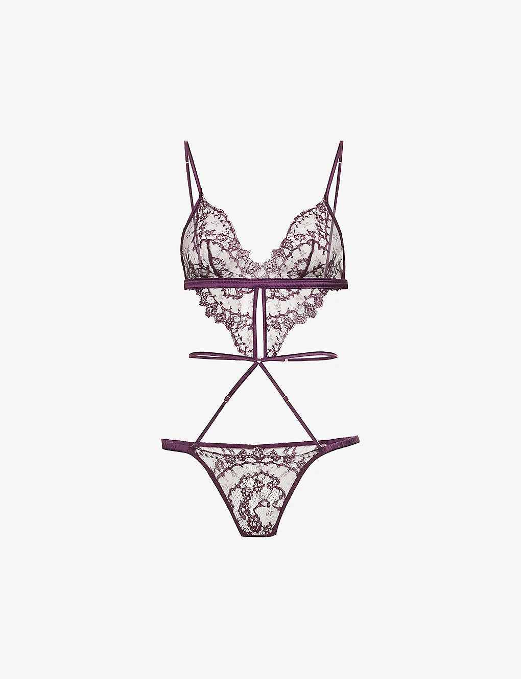 - Fitted, V-neck, adjustable straps, gold-toned hardware, elasticated waistband, all-over sheer lace panels, scalloped trims, open gusset