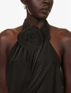 - Slim fit, asymmetric neckline, one shoulder, sleeveless, ruched design, floral three dimensional pieces