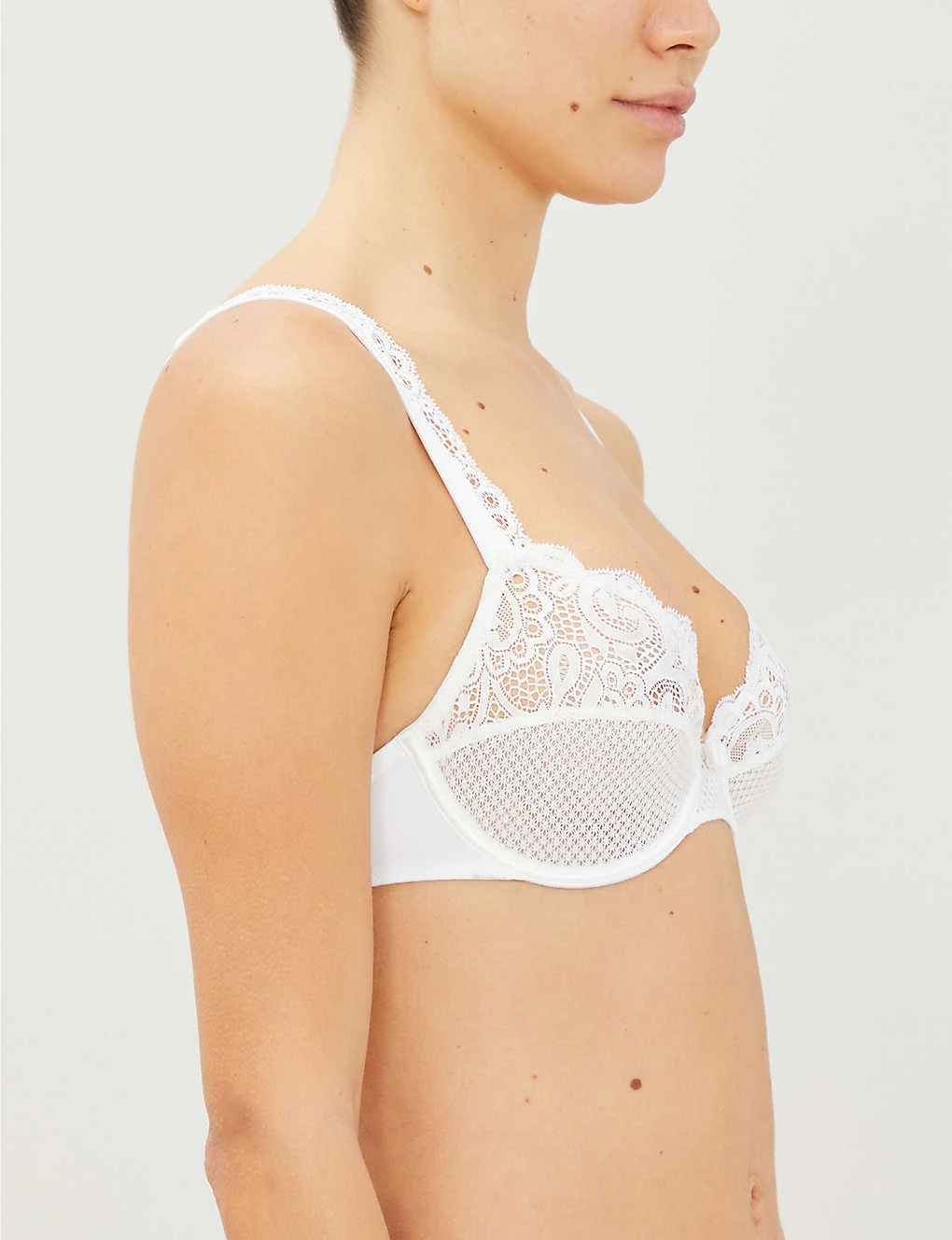 - Adjustable shoulder straps with lace trims, soft cups, contrasting lace panelling at cups, underwired, elasticated satin wings