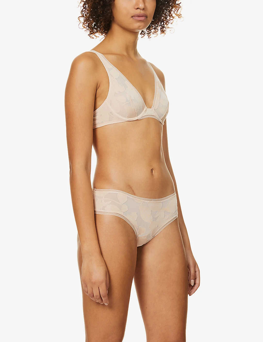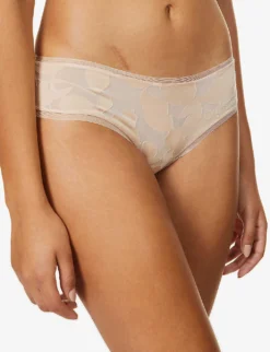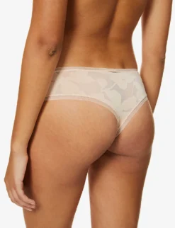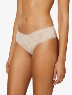 - Mid rise, elasticated waistband, striped trims, semi-sheer
