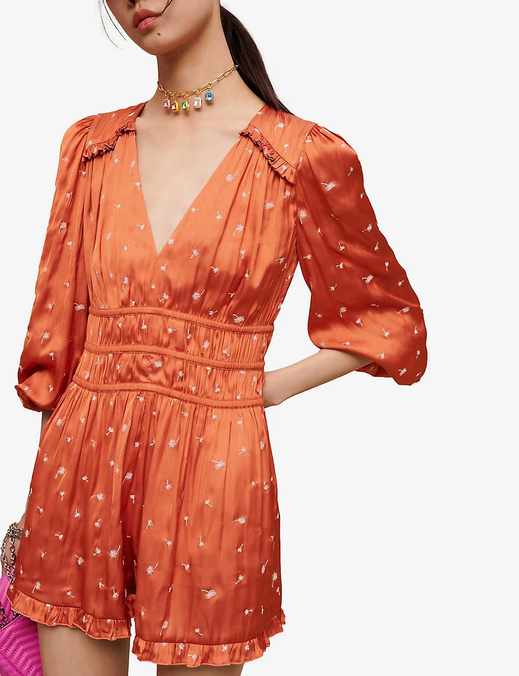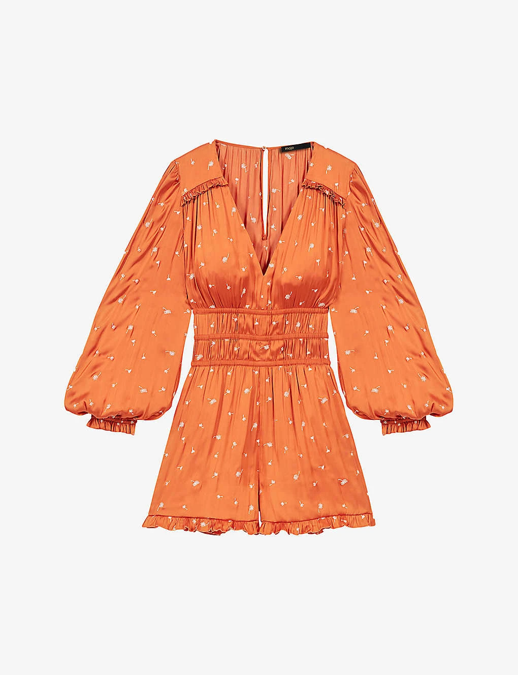 - V-neck, three-quarter-length balloon sleeves, gathered panels at waist, ruffle trim at shoulder and hem, all-over ditsy floral embroidery