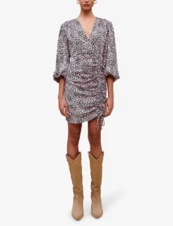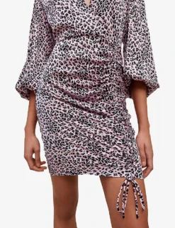 - V-neck, three quarter-length sleeves, fitted cuffs, all-over leopard print, wrap bodice, draped fastening at side, mini skirt