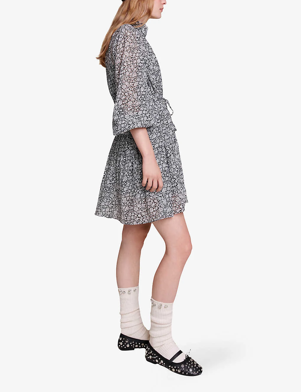 - Stand collar, V-neck, three quarter-length sleeves, elasticated cuffs, self-tie elasticated waistband, mini skirt, all-over floral print