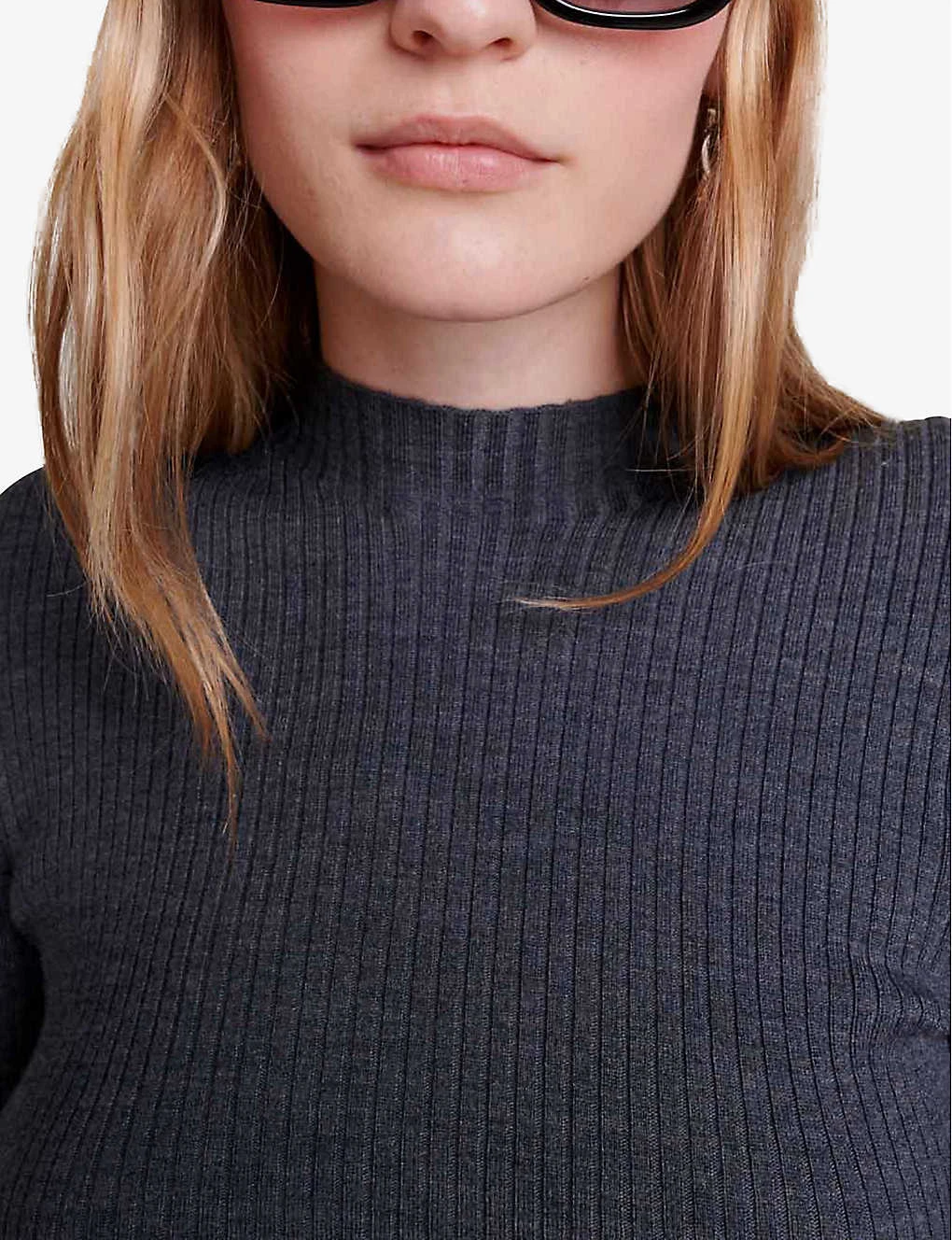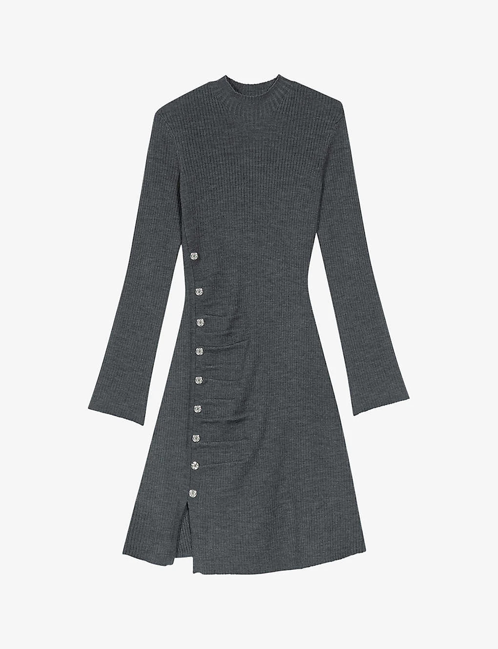 - High neck, long sleeves, exposed buttons at side, flared skirt, silver-toned hardware, all-over ribbed knit, split at front hem