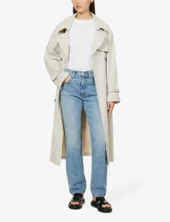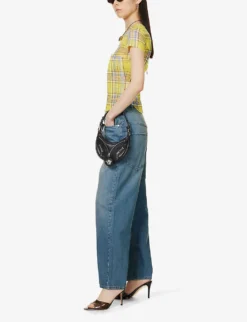 - Regular fit, high rise, straight leg, structured waistband, belt loops, five pockets, V-shaped yoke at back, brand patch at back, contrast stitching, mid-faded wash, branded silver-toned hardware