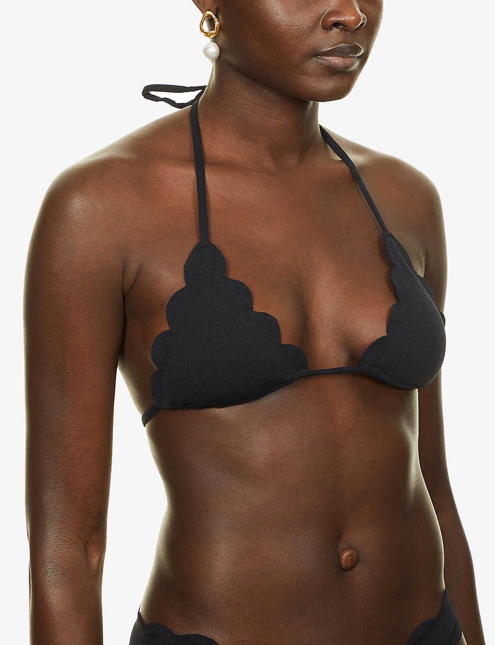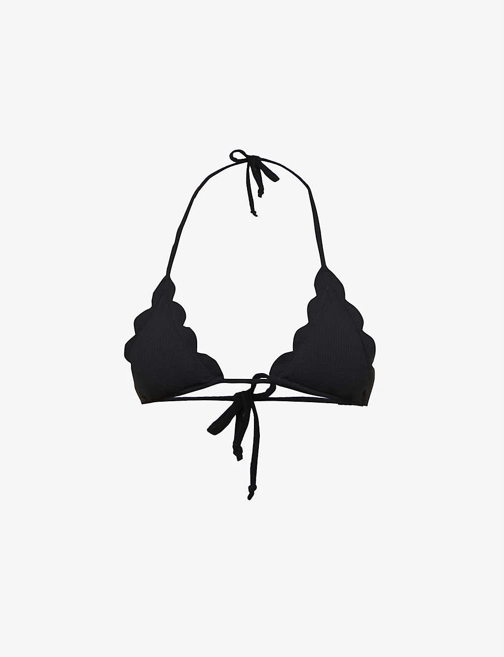 - Halterneck, triangle cups, removable padding, scalloped trims