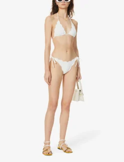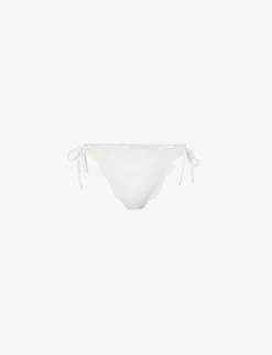 - Mid-rise, elasticated waistband, all-over textured panels, scalloped trims, mid-coverage at back, fully lined