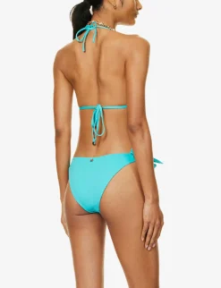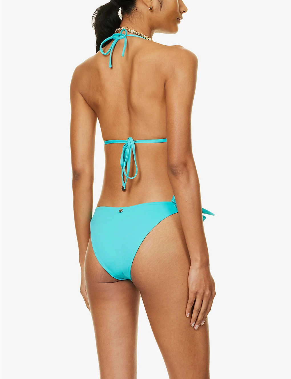 - Halterneck, V-neck, soft triangle cups, removable padding at cups, brand-engraved metallic pendants at straps
