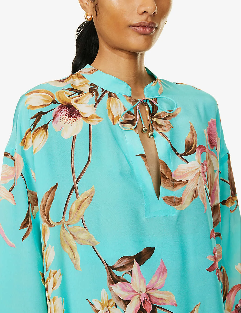 - Regular-fit, plunge V-neck, collar, long sleeves, all-over floral pattern, split sides