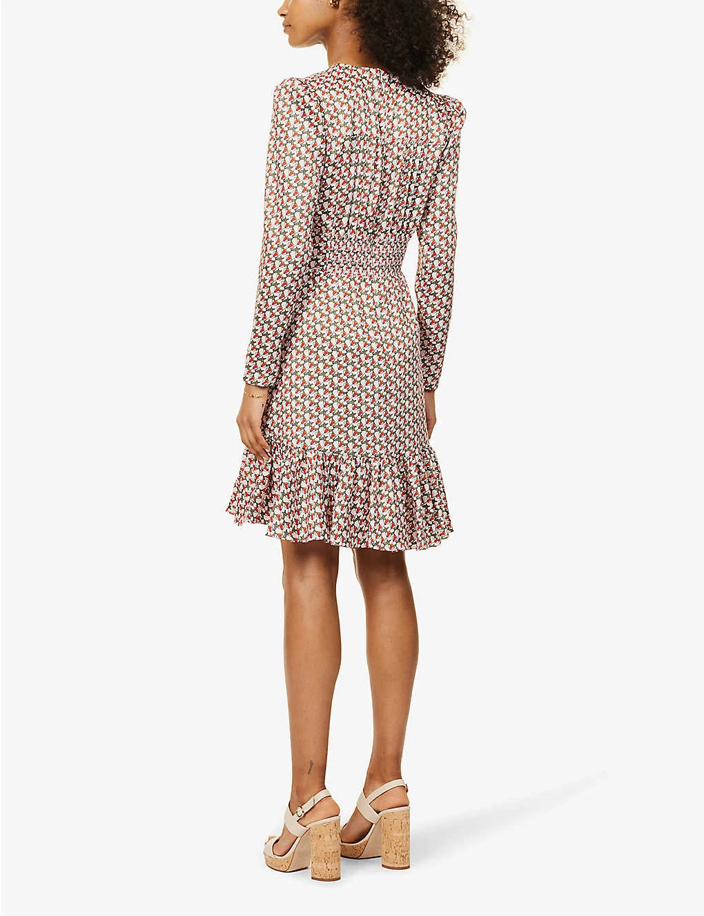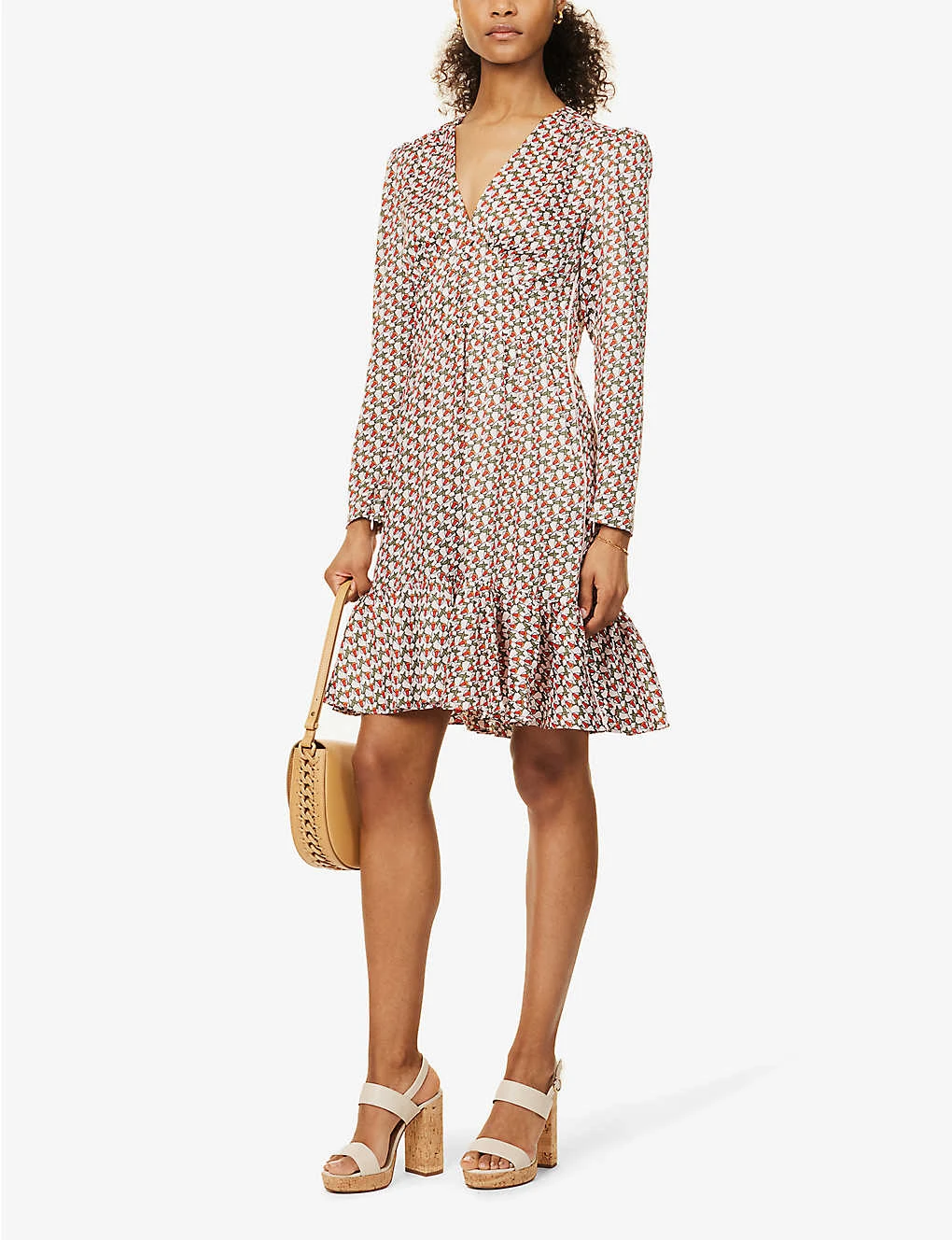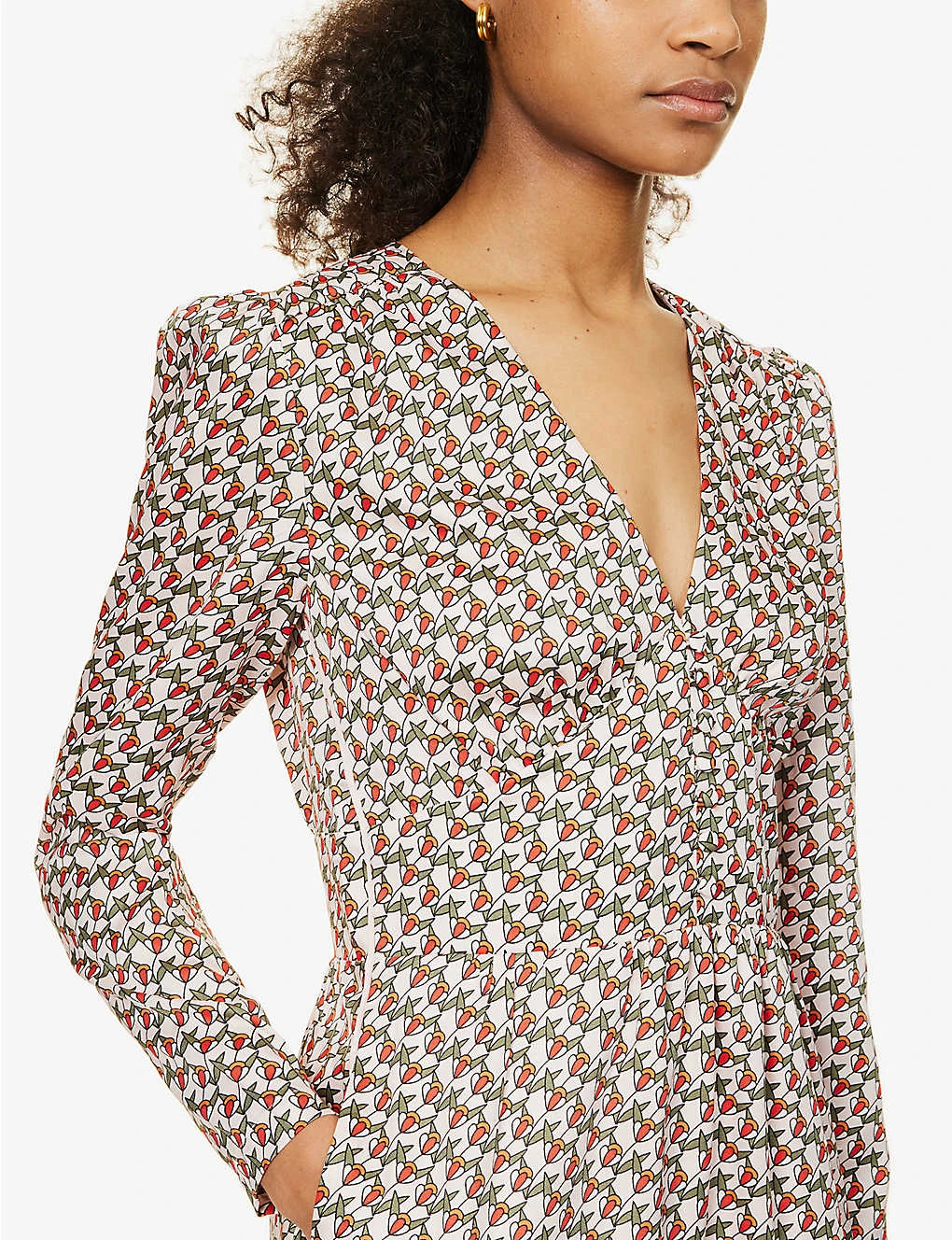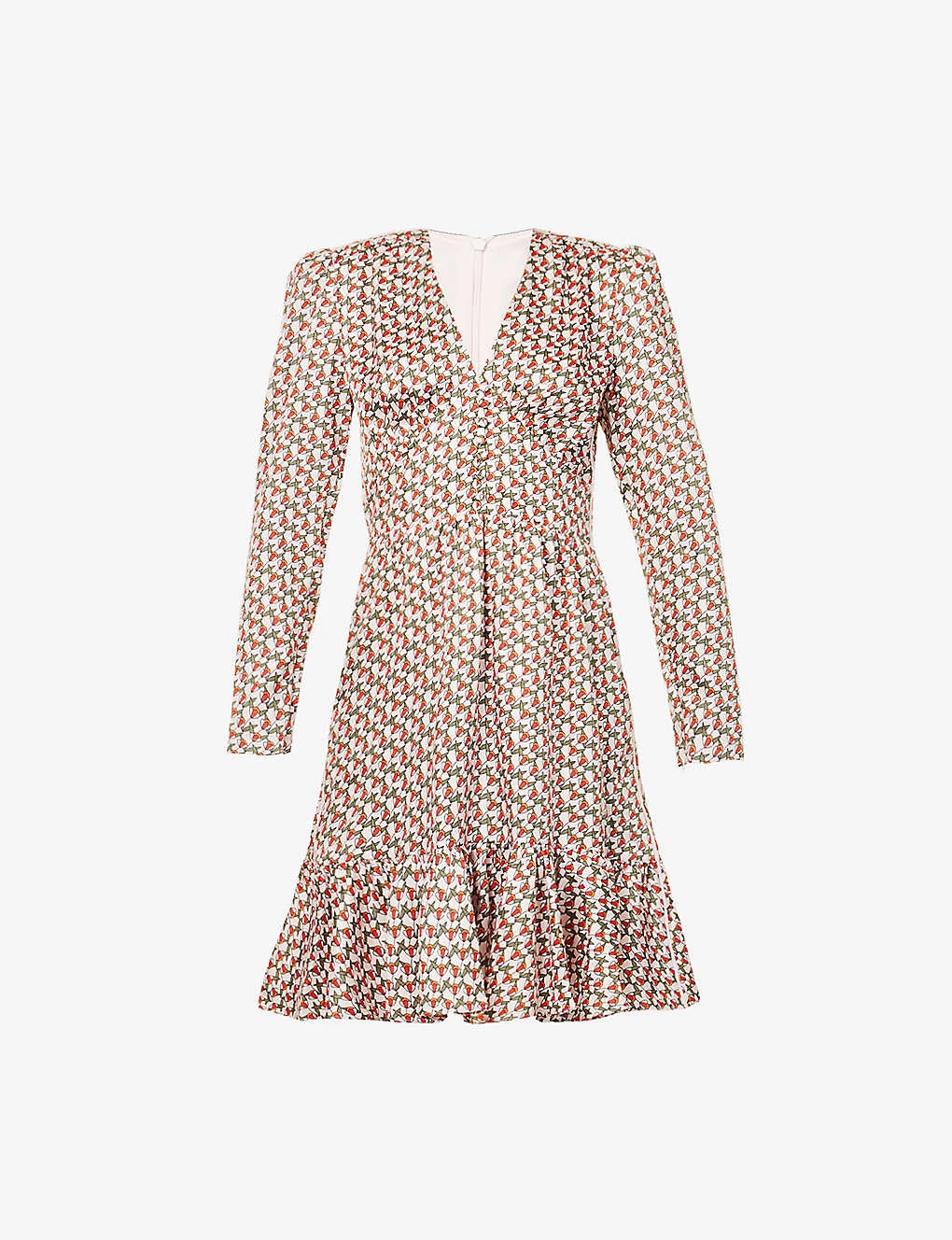 - Regular fit, V-neck, long sleeves, zip opening at cuffs, two slip pockets at front, piping at sides, all-over print, fully lined, tiered flare hem