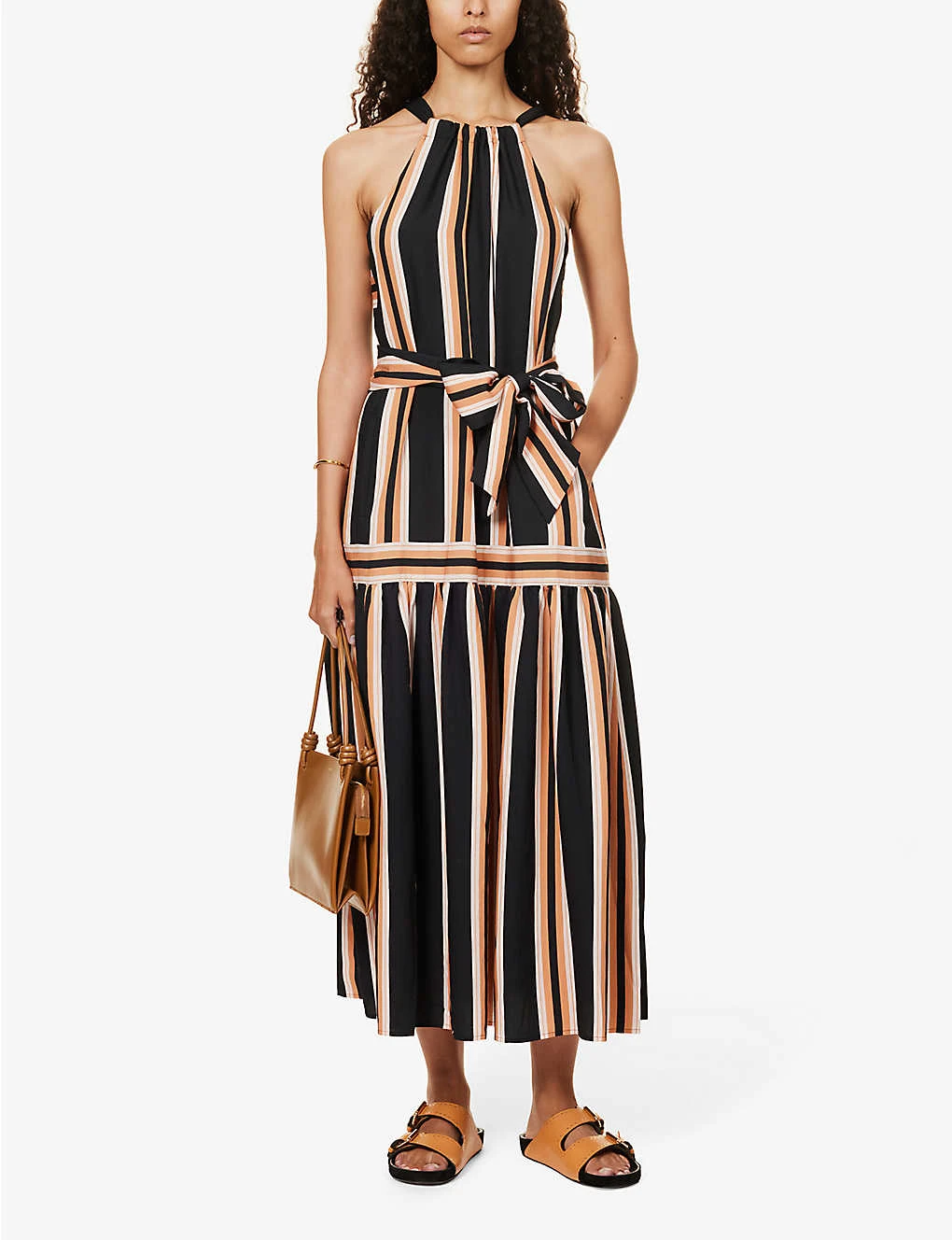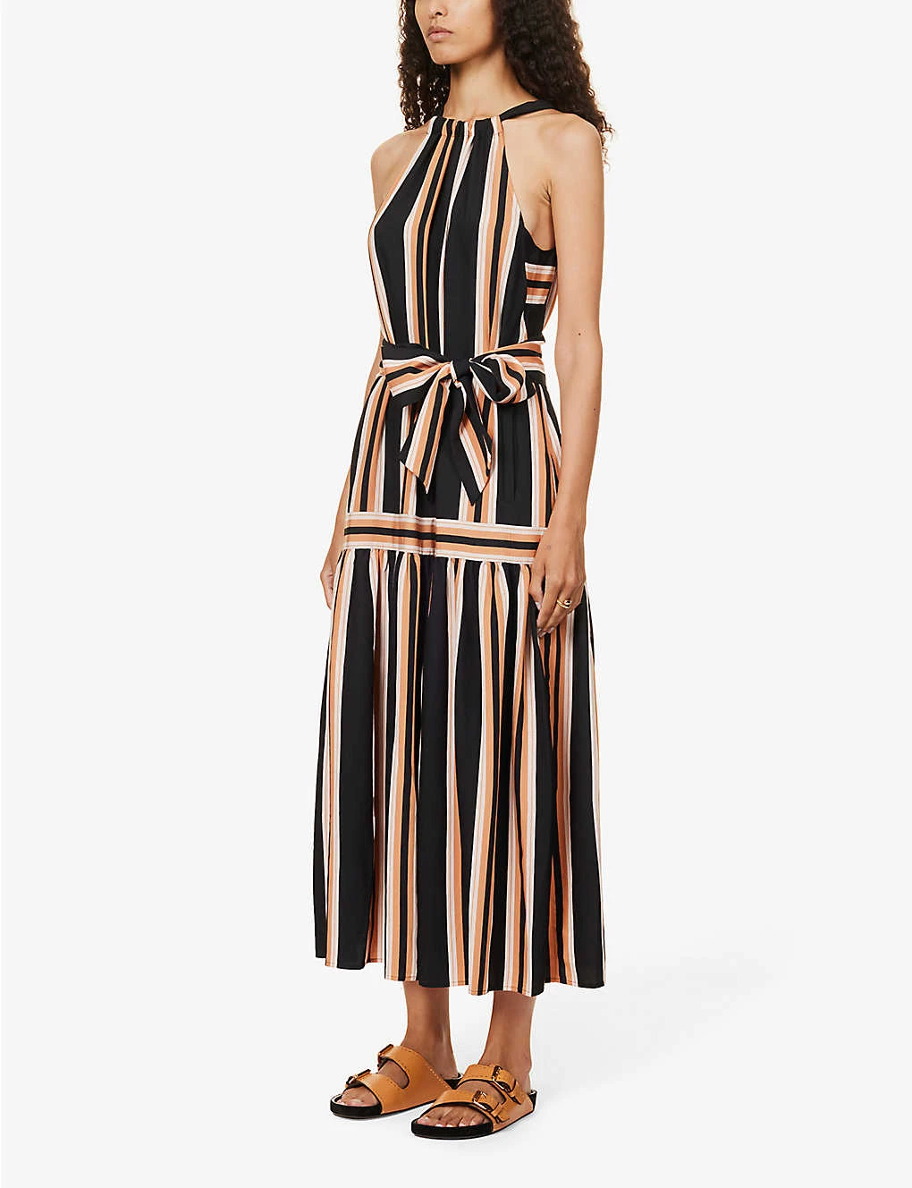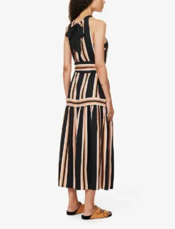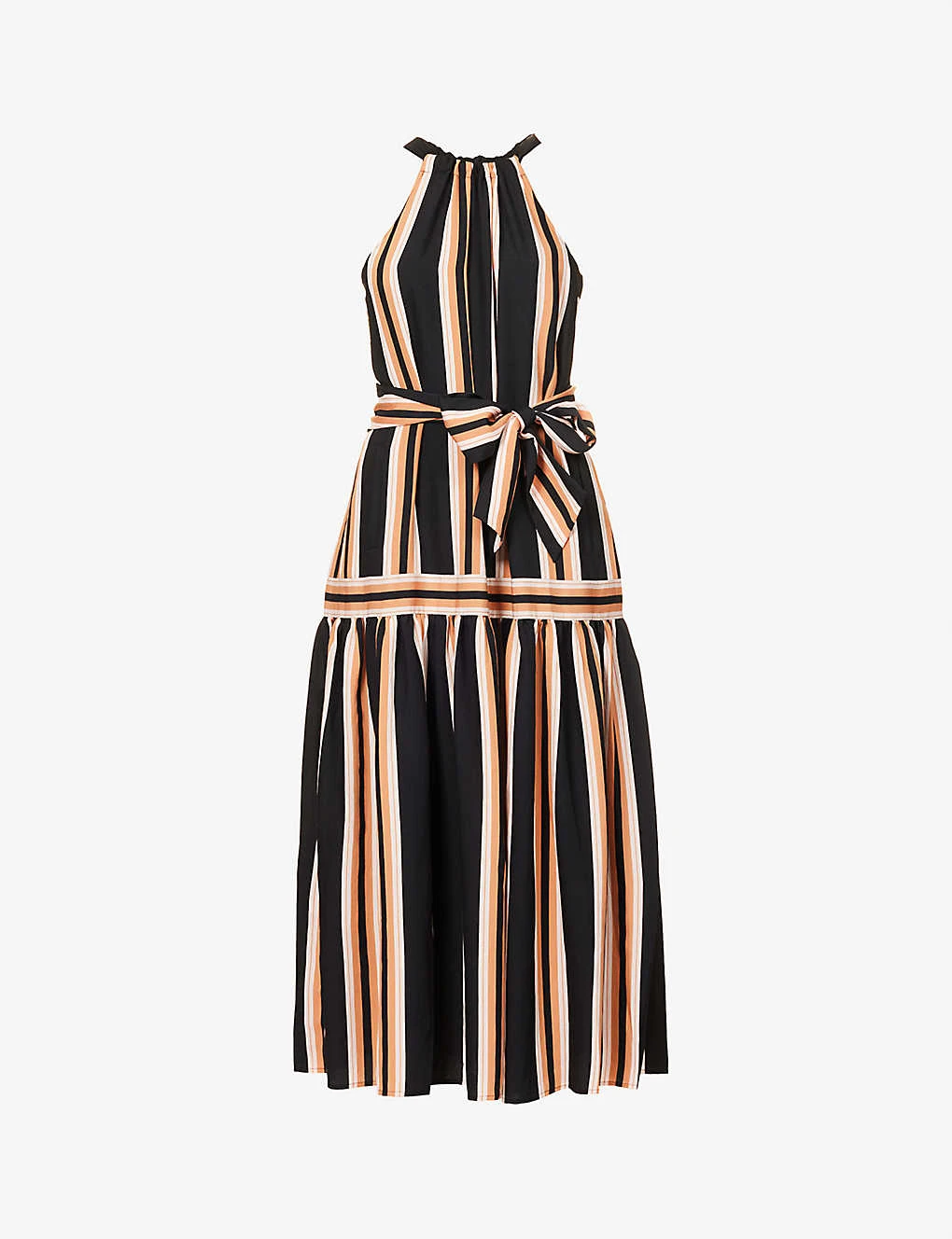 - Regular fit, halterneck, sleeveless, keyhole at back, stripe pattern, self-tie at waist, flared hem