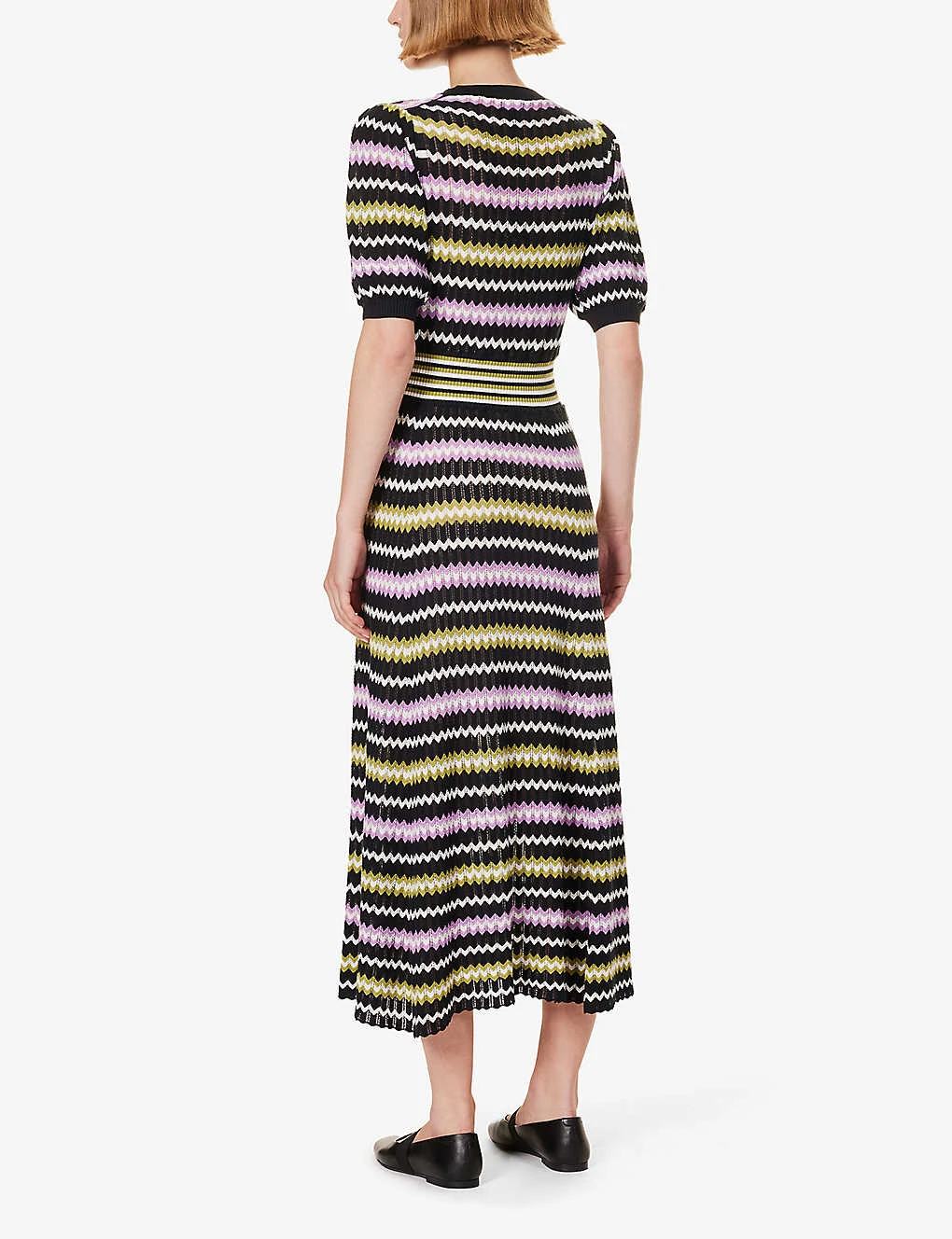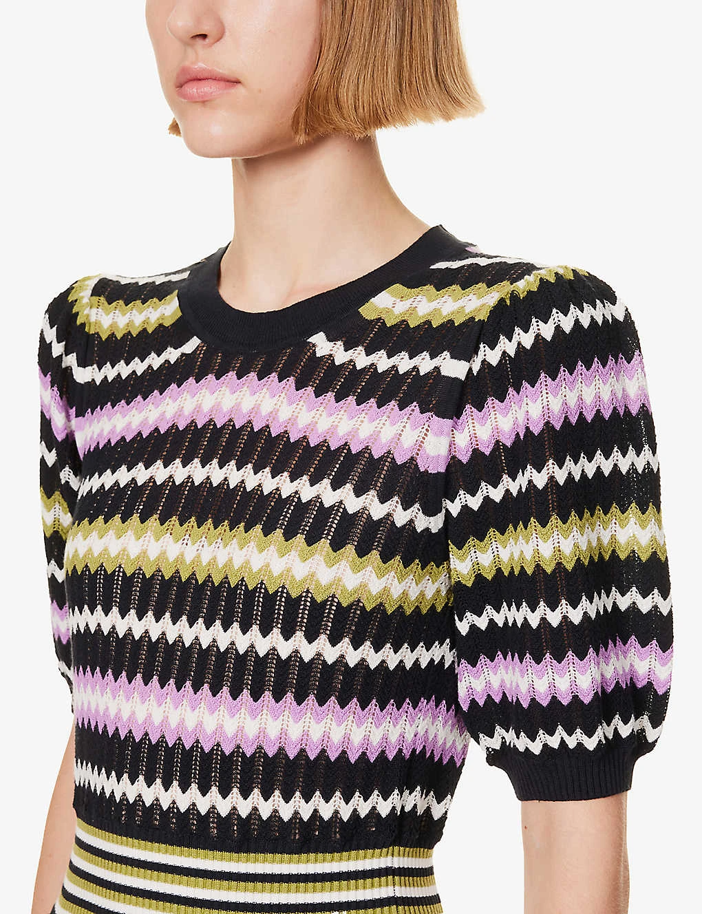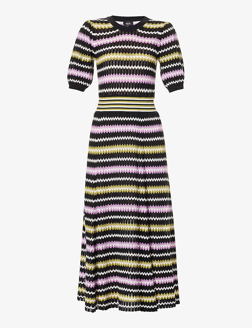 - Fit and flare silhouette, round neck, short puff sleeves, elasticated ribbed waist, medium knit, all-over zigzag pattern