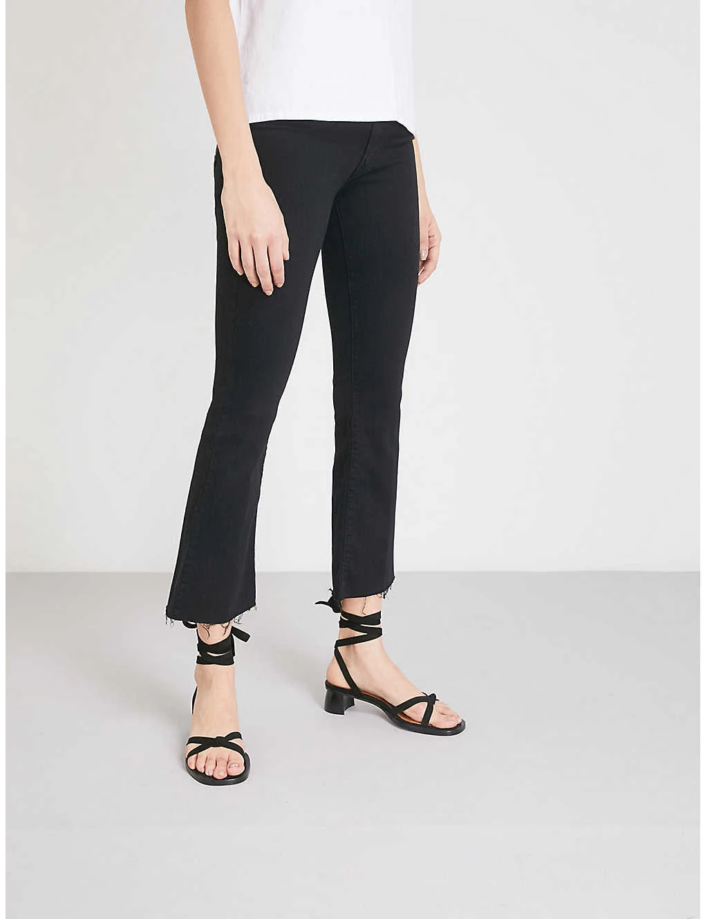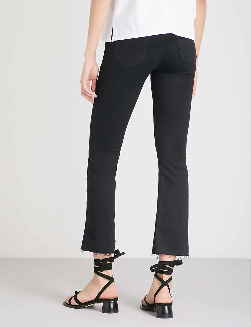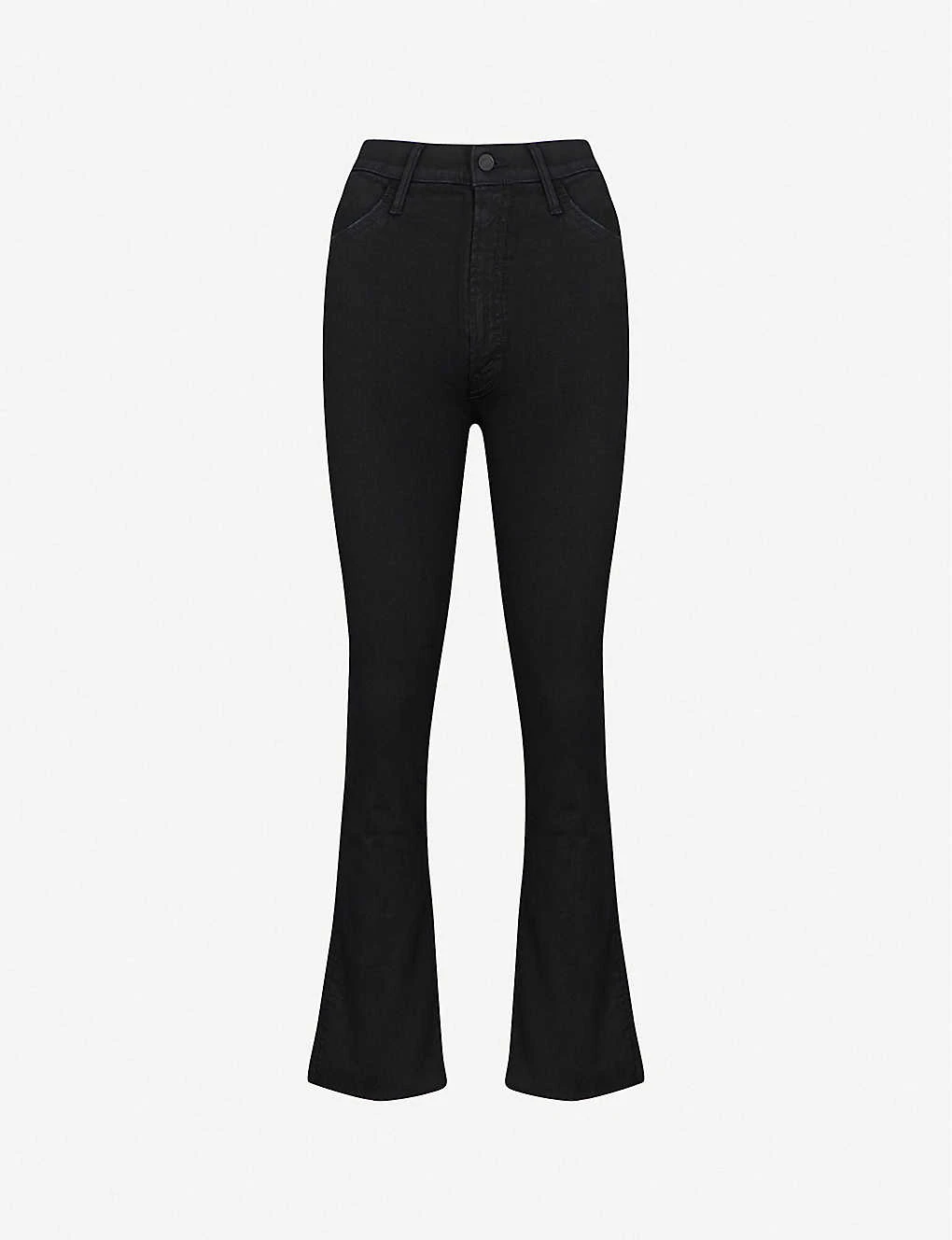 MOTHER stretch-denim jeans Exposed button and concealed zip-fly fastening at front Slim-fit, flared, high-rise, belt loops, five pockets, branded hardware, v-shaped yoke at back, branded tab at back waistband, frayed hem 92.5% cotton, 5% polyester, 2.5% elastane Machine wash True to size Size 26: Rise 11″”, inside leg 26″”, leg opening 19″” Model is 5ft 10″” and wears a size 26 Made in USA