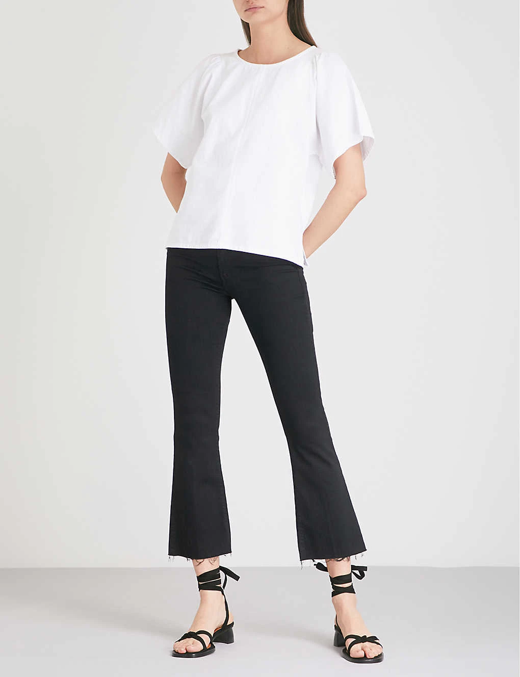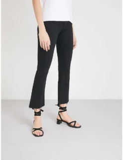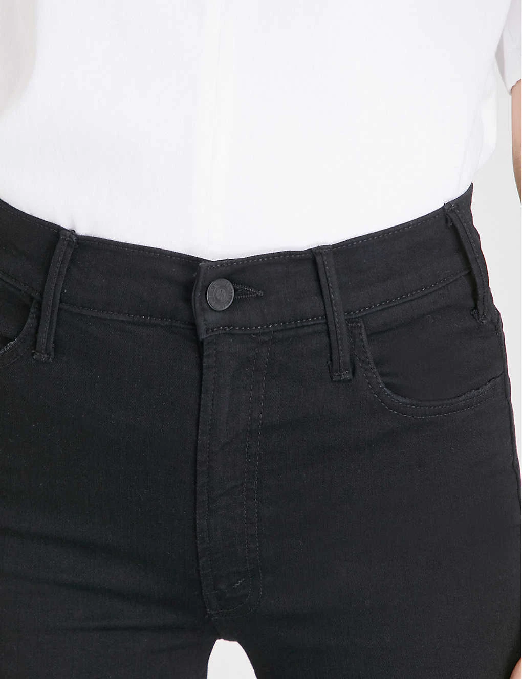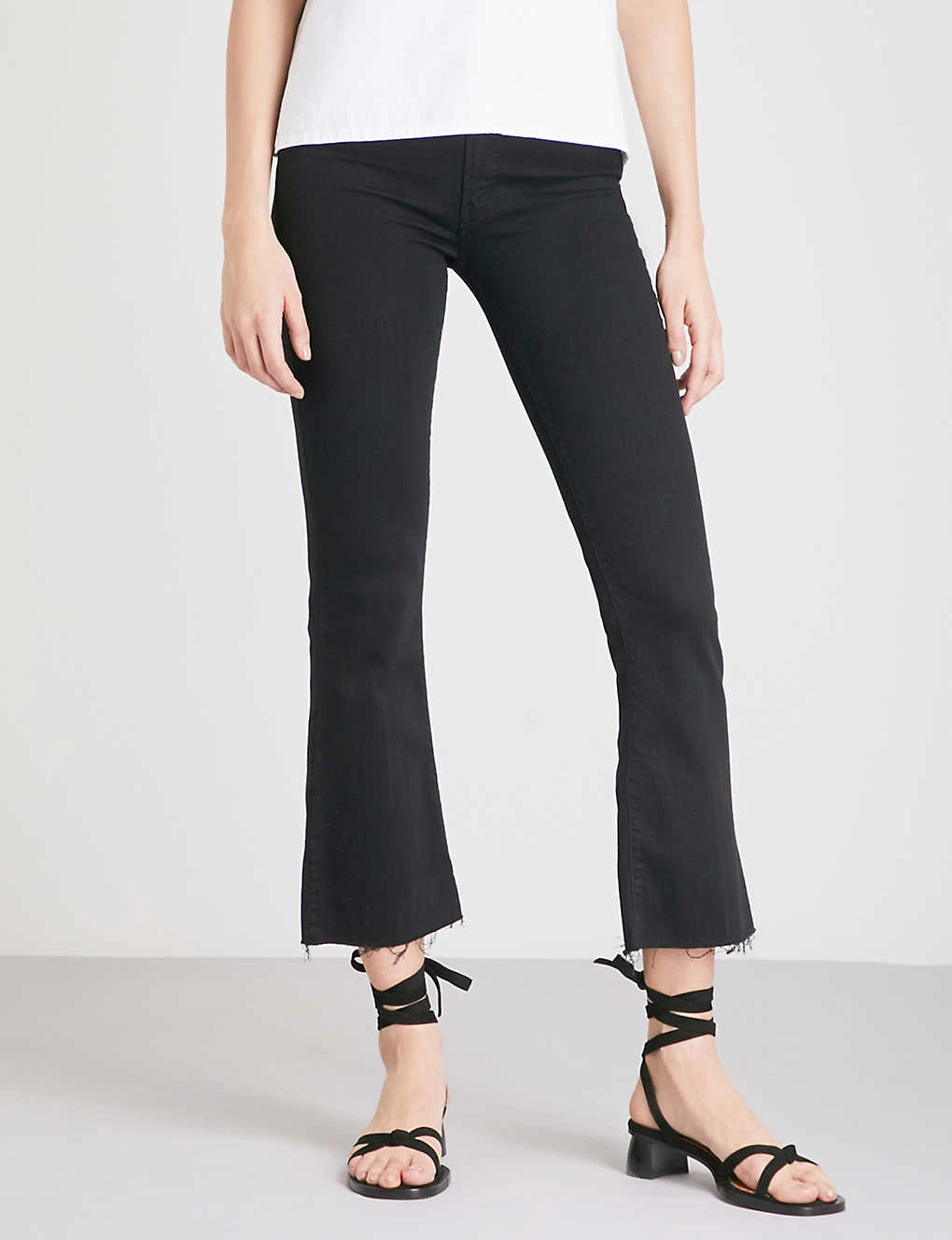 MOTHER stretch-denim jeans Exposed button and concealed zip-fly fastening at front Slim-fit, flared, high-rise, belt loops, five pockets, branded hardware, v-shaped yoke at back, branded tab at back waistband, frayed hem 92.5% cotton, 5% polyester, 2.5% elastane Machine wash True to size Size 26: Rise 11″”, inside leg 26″”, leg opening 19″” Model is 5ft 10″” and wears a size 26 Made in USA