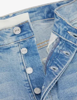 - Regular fit, mid rise, straight leg, belt loops, three pockets at front, two embroidered pockets at back, branded logo tab, faded wash and whiskering, contrast stitching, distressed at legs