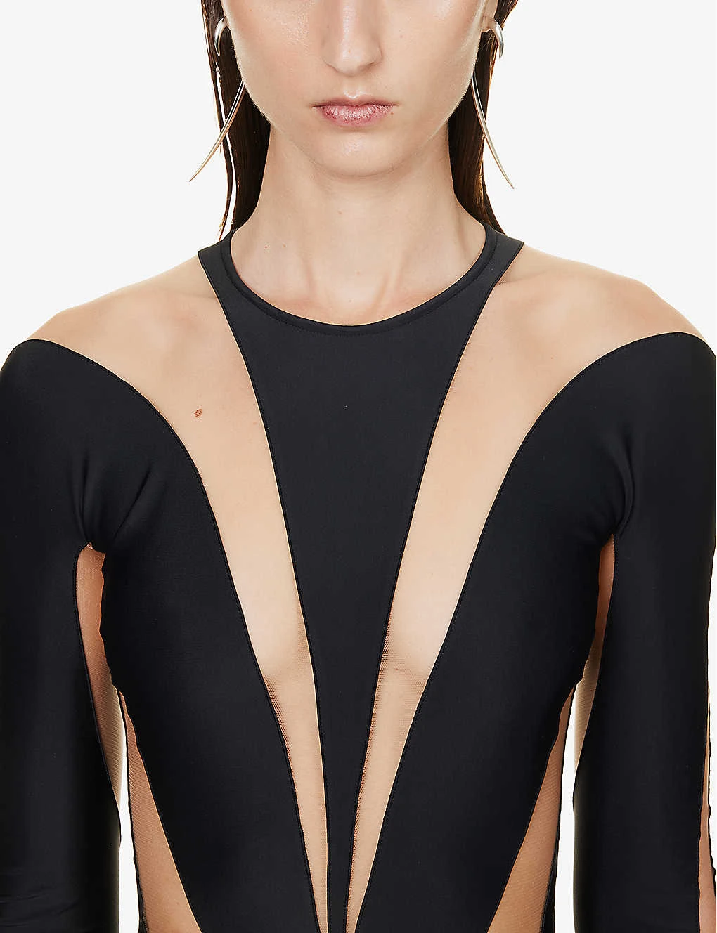 - Slim fit, round neckline, long sleeves, metallic brand plaque at front, silver-toned hardware, all-over mesh panels