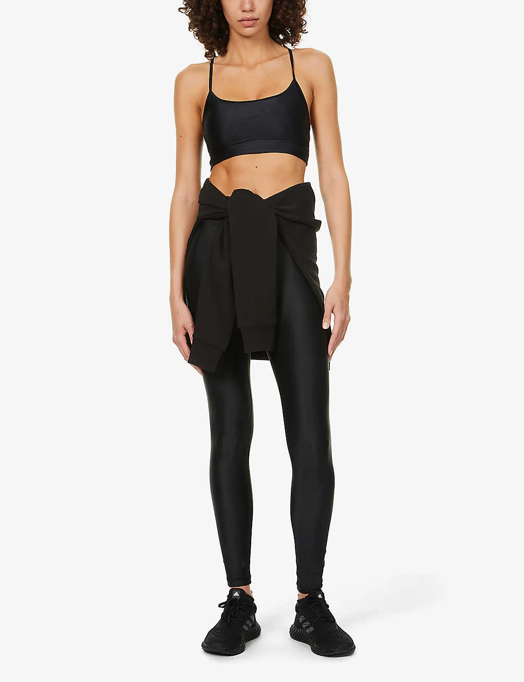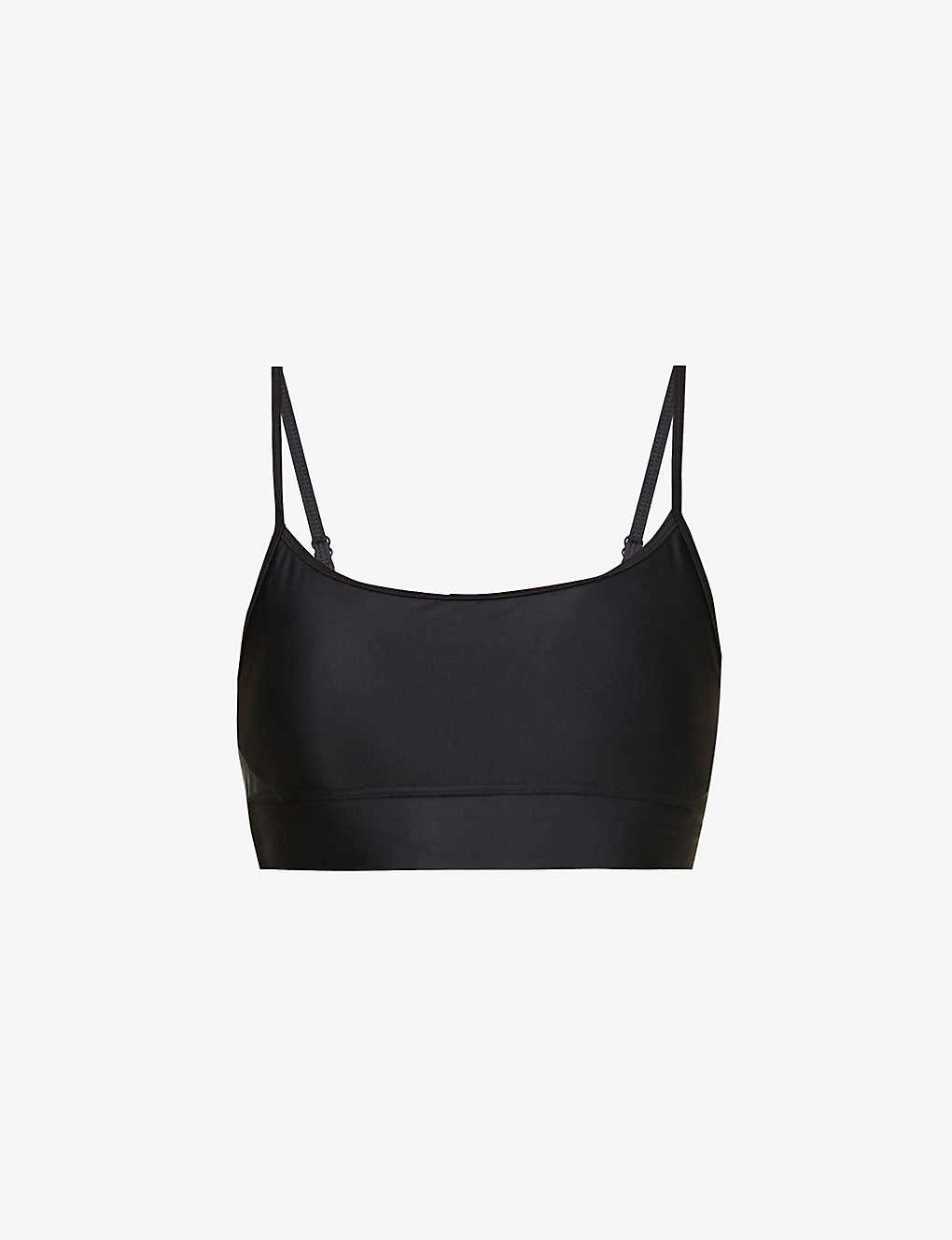 - Scoop neck, adjustable spaghetti straps, padded cups, branded print at back neckline, fitted, cropped