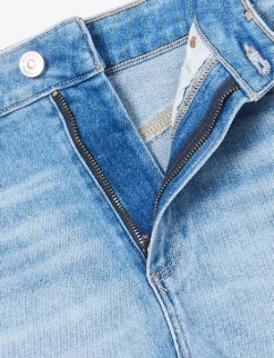 - Regular fit, mid-rise, structured waistband with belt loops, five pockets, curved yoke at back, brand patch at back, mid-faded wash, contrast stitching, distressed patches, raw frayed hems