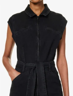 - Regular fit, collar, cap sleeves, straight leg, two welt pockets at chest, darts at front, belt loops, detachable self-tie belt, two slip pockets at front, two patch pockets at back, faded wash