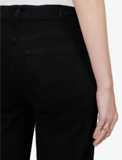 - Slim fit, mid-rise, wide leg, structured waistband, belt loops, five pockets, curved yoke at back, patent brand patch at back, branded hardware