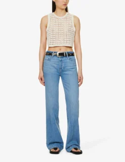 - Slim fit, mid-rise, wide leg, structured waistband, belt loops, five pockets, curved yoke at back, patent brand patch at back, branded hardware