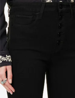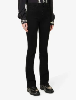 - Slim fit, high rise, bootcut leg, structured waistband, belt loops, five pockets, curved yoke at back, patent brand patch at back, branded hardware