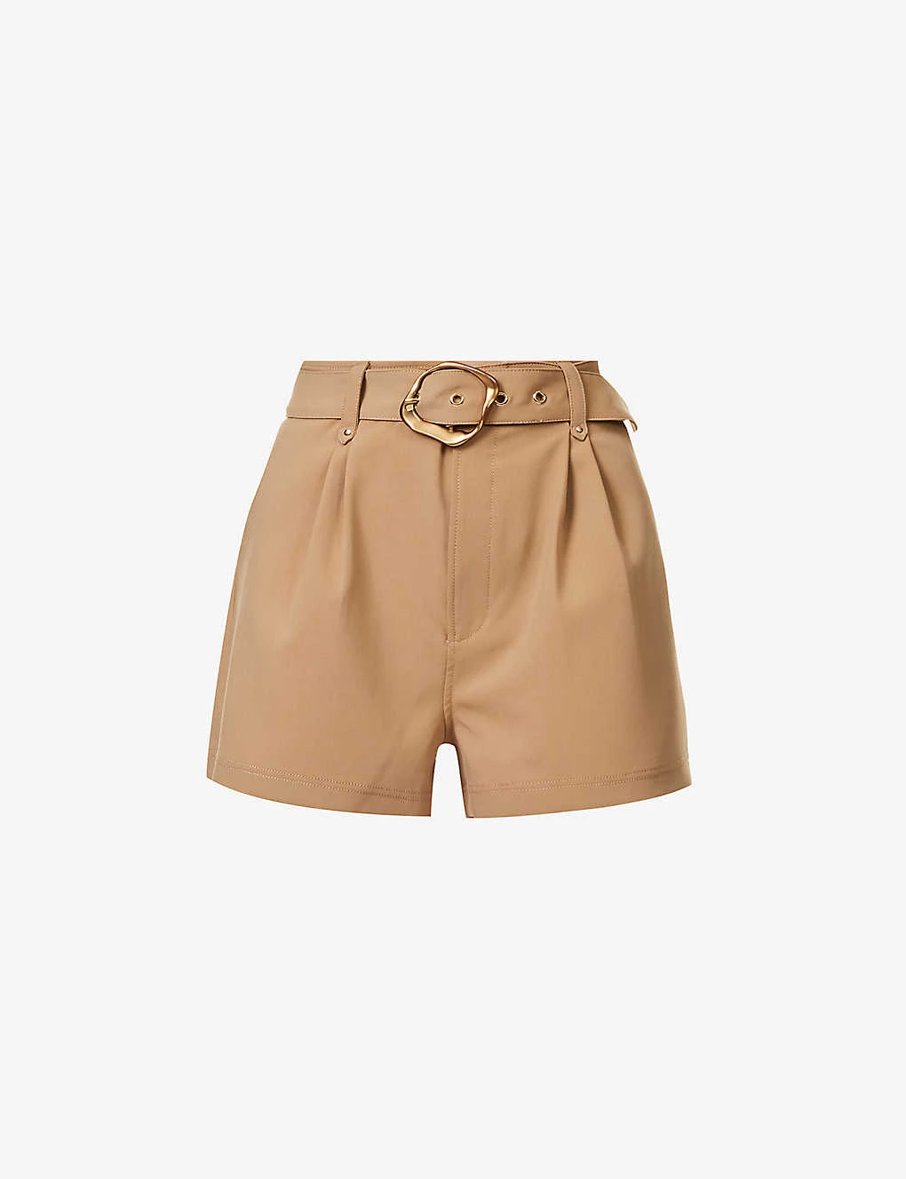 - Regular fit, mid-rise, structured waistband with belt loops, detachable belt, two slip pockets at front, darts at back, two welt pockets at back, gold-toned hardware