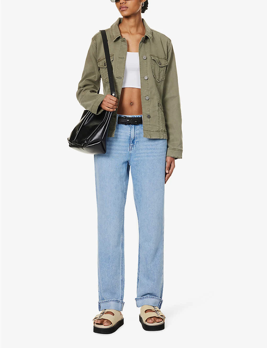 - Exposed button and concealed zip-fly fastening at front
