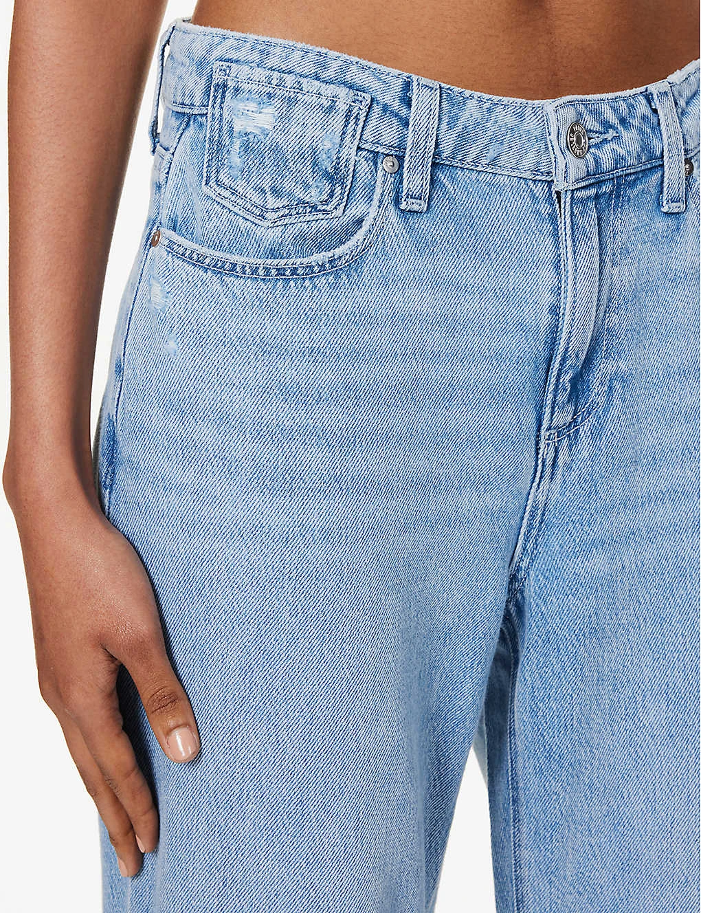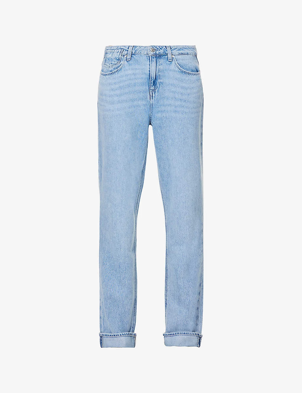 - Relaxed fit, mid-rise, straight leg, belt loops, five pockets, faded wash, branded silver-toned hardware, folded cuffs
