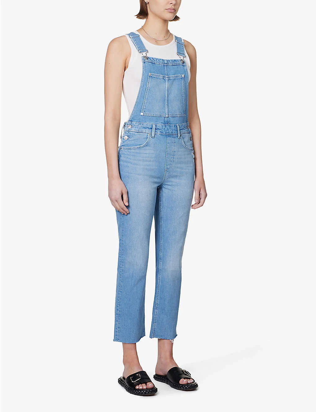 - Regular fit, square neck, adjustable shoulder straps, patch pocket at chest, two slip pockets at front, brand patch at back, two patch pockets at back, branded hardware, distressed panels, faded wash, raw hems