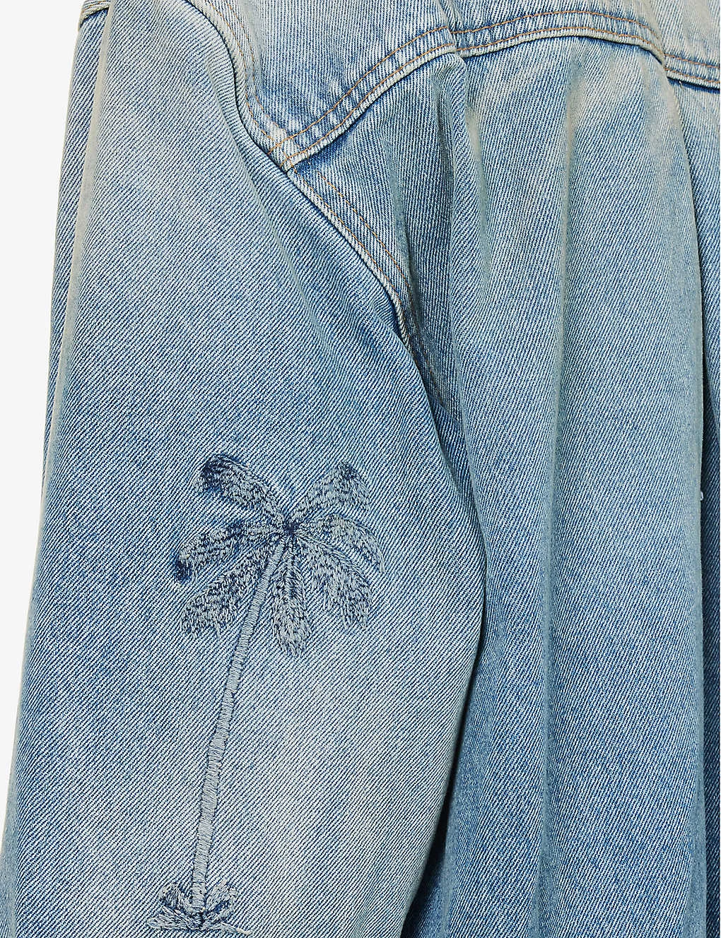 - Relaxed fit, collar, dropped shoulders, long sleeves, buttoned sleeve hems, brand palm embroidery at sleeve, two flap pockets at chest, straight yoke with pleat at back, faded wash, curved hem