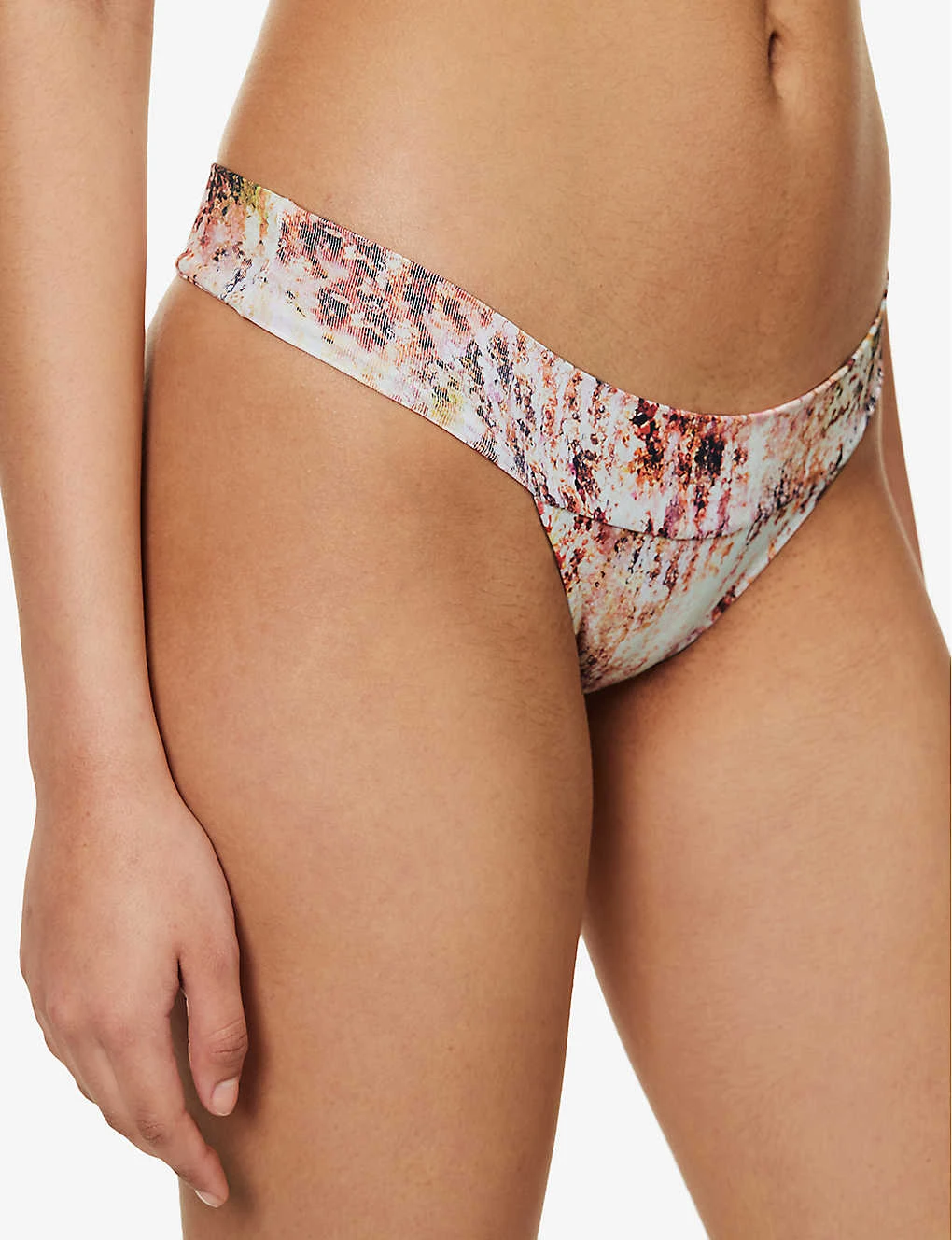 - Mid-rise, high leg, low coverage at back, all-over graphic pattern, fully lined