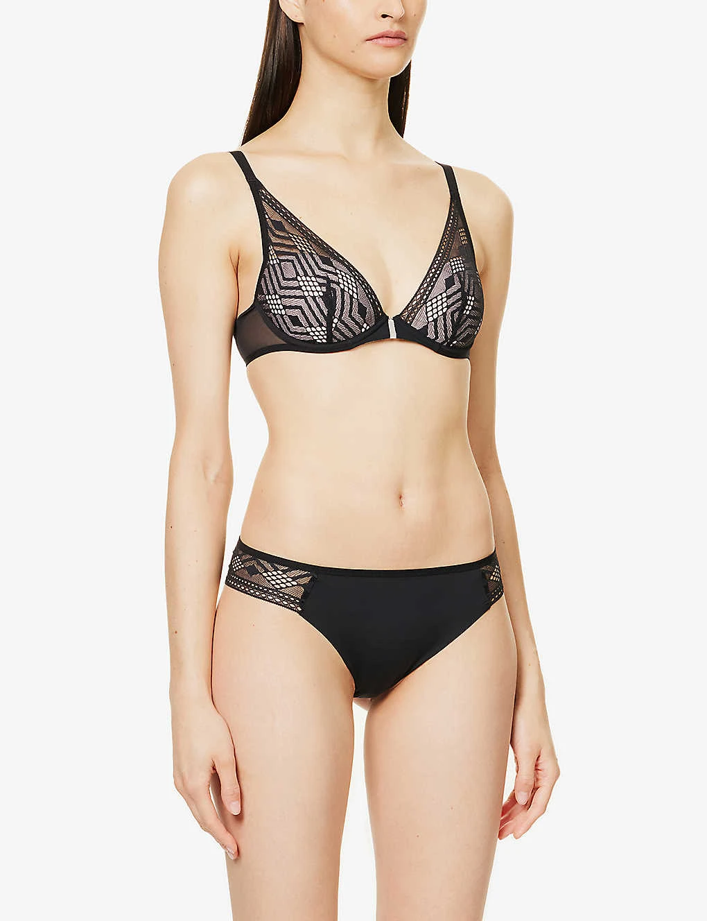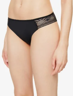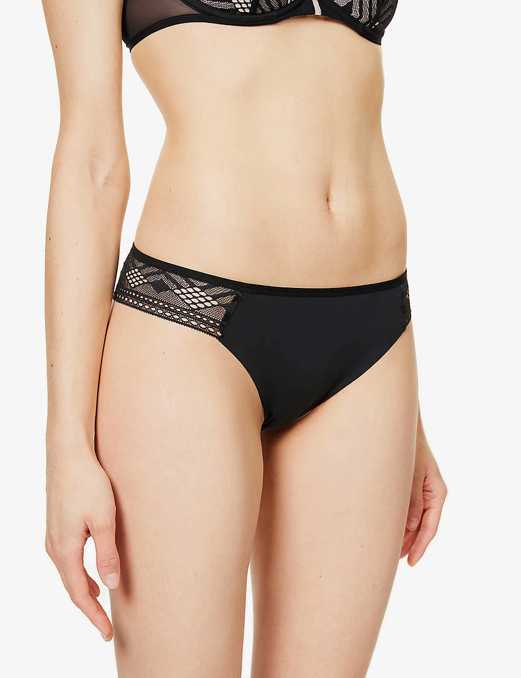 - Mid-rise, elasticated waistband, sheer lace panel, geometric lace pattern, cut-out at front, mid-coverage at back