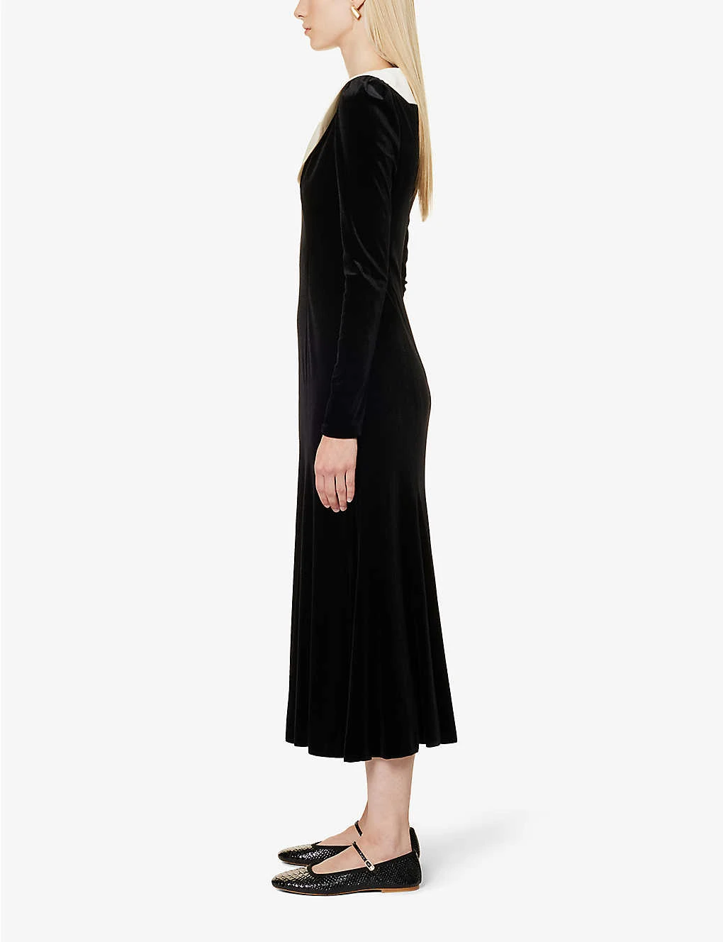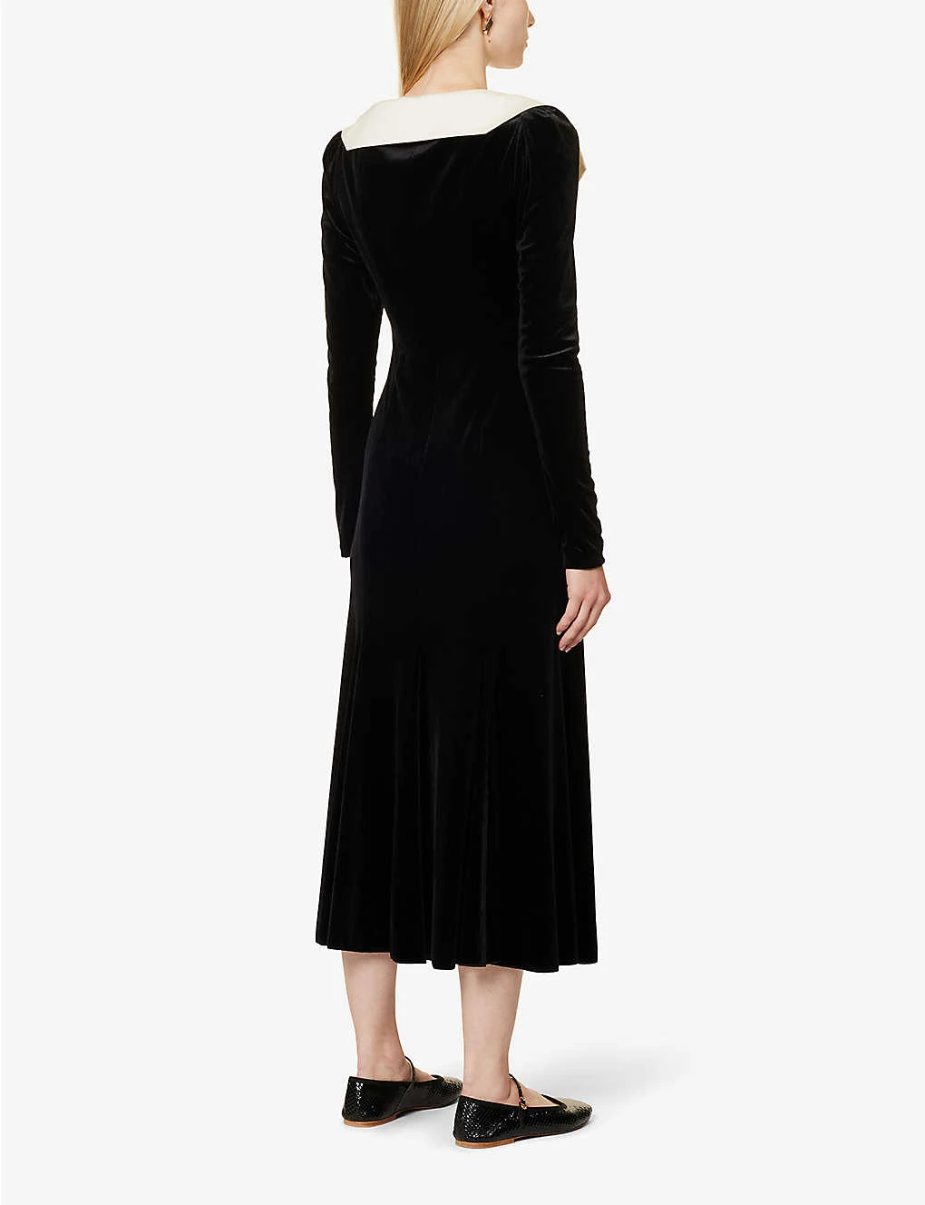 - Regular fit, V-neckline, contrast collar, long sleeves, flared skirt
