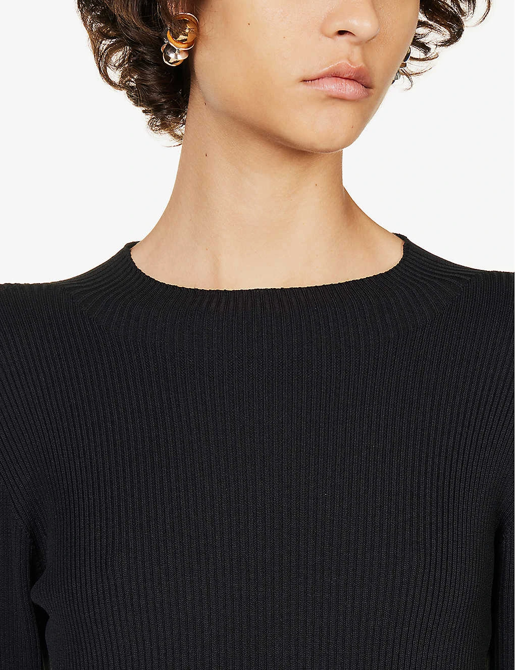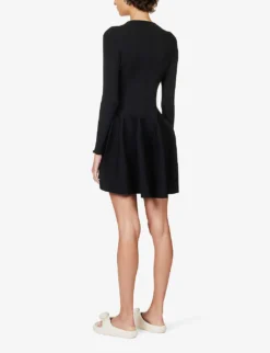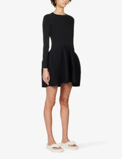 - Fit and flare silhouette, high neck, long sleeves, pleated knit at bodice, contrast pleated knit at skirt