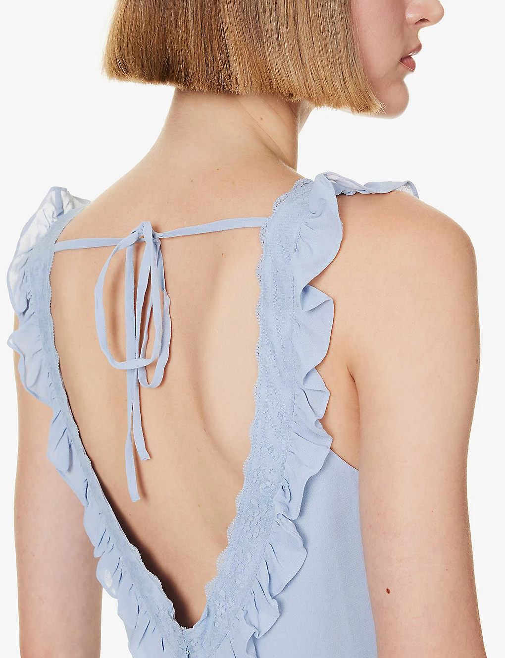 - Slim fit, V-neck, sleeveless, frilled trim at neck and back, pleated at chest, semi-sheer lace panels at front, flared hem