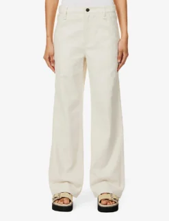 - Relaxed fit, low-rise, straight leg, belt loops, five pockets, brand patch at back