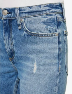 - Regular fit, mid-rise, straight leg, structured waistband with belt loops, five pockets, curved yoke at back, contrast stitching, distressed at front, faded wash, branded silver-toned hardware, brand patch at back, raw hems