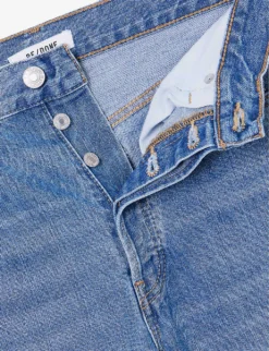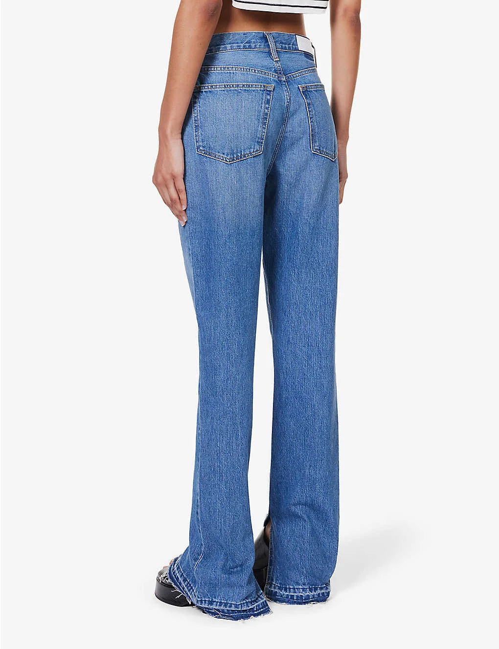 - Regular fit, mid-rise, straight leg, structured waistband with belt loops, five pockets, brand patch at back, curved yoke at back, mid-faded wash, contrast stitching, branded hardware, split at cuffs, raw cuffs