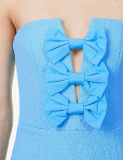 - Slim fit, bandeau neckline, strapless, bows at chest with cut-out panels, darts at front and back, jacquard texture, split hem, lined