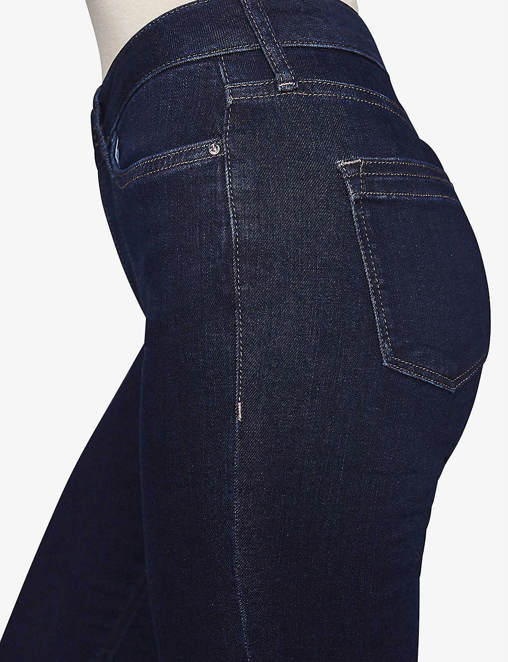 - Mid-rise, skinny leg, , belt loops, five pockets, branded hardware, contrast stitching, v-shaped yoke at back