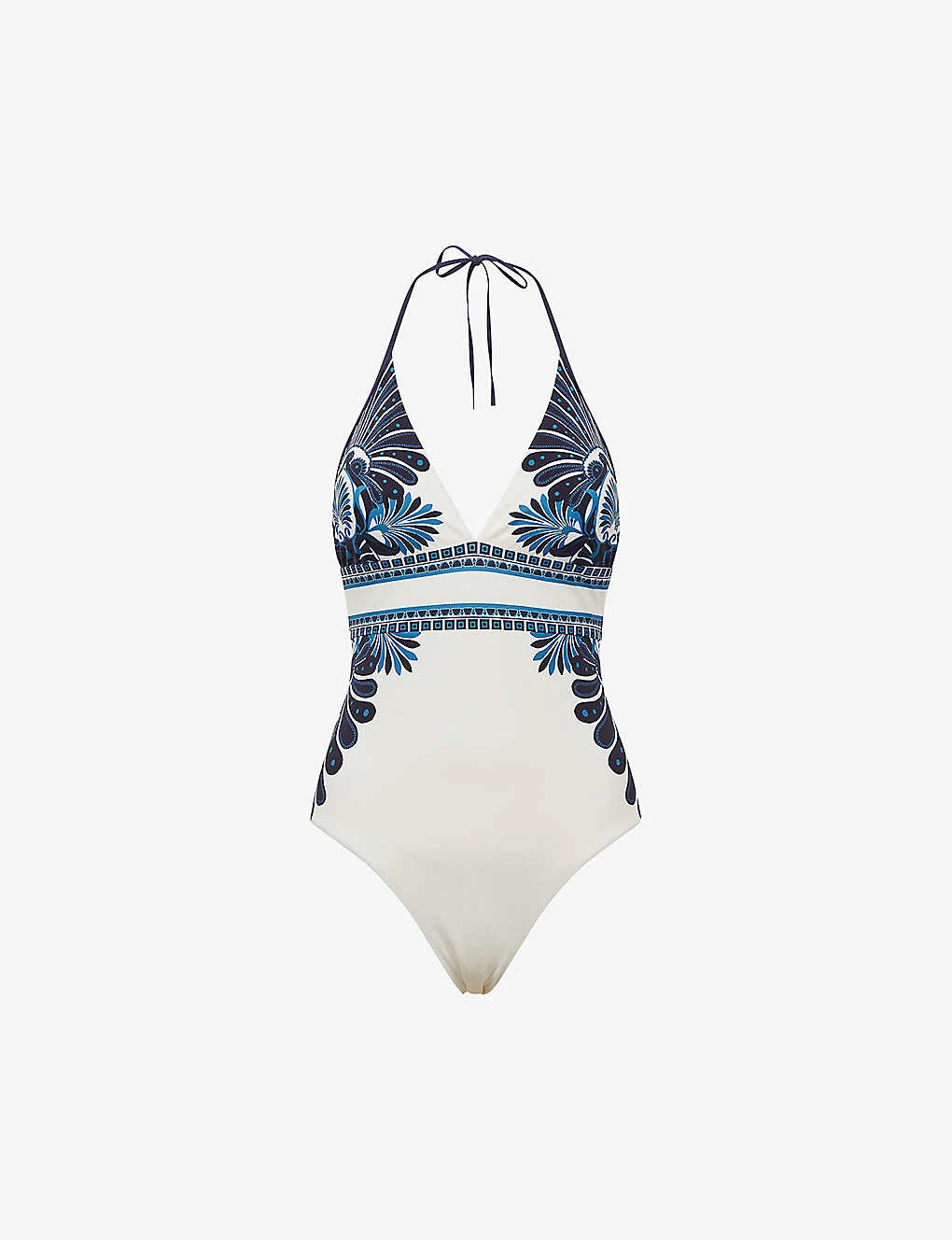 - Deep V-neck, halterneck, printed, mid-coverage at back, removeable padding