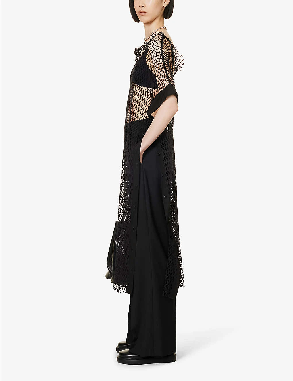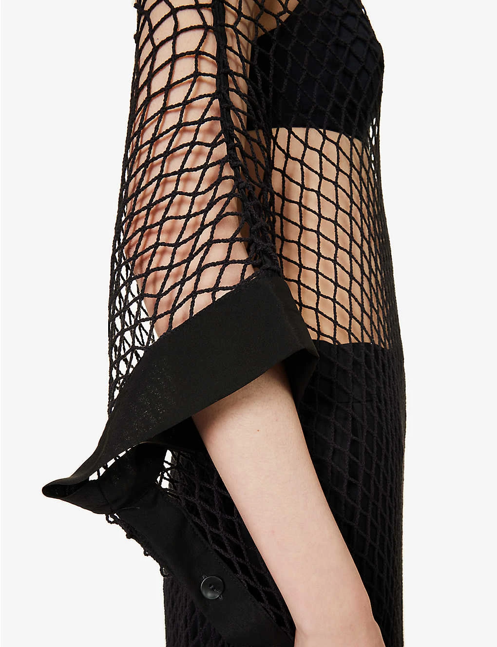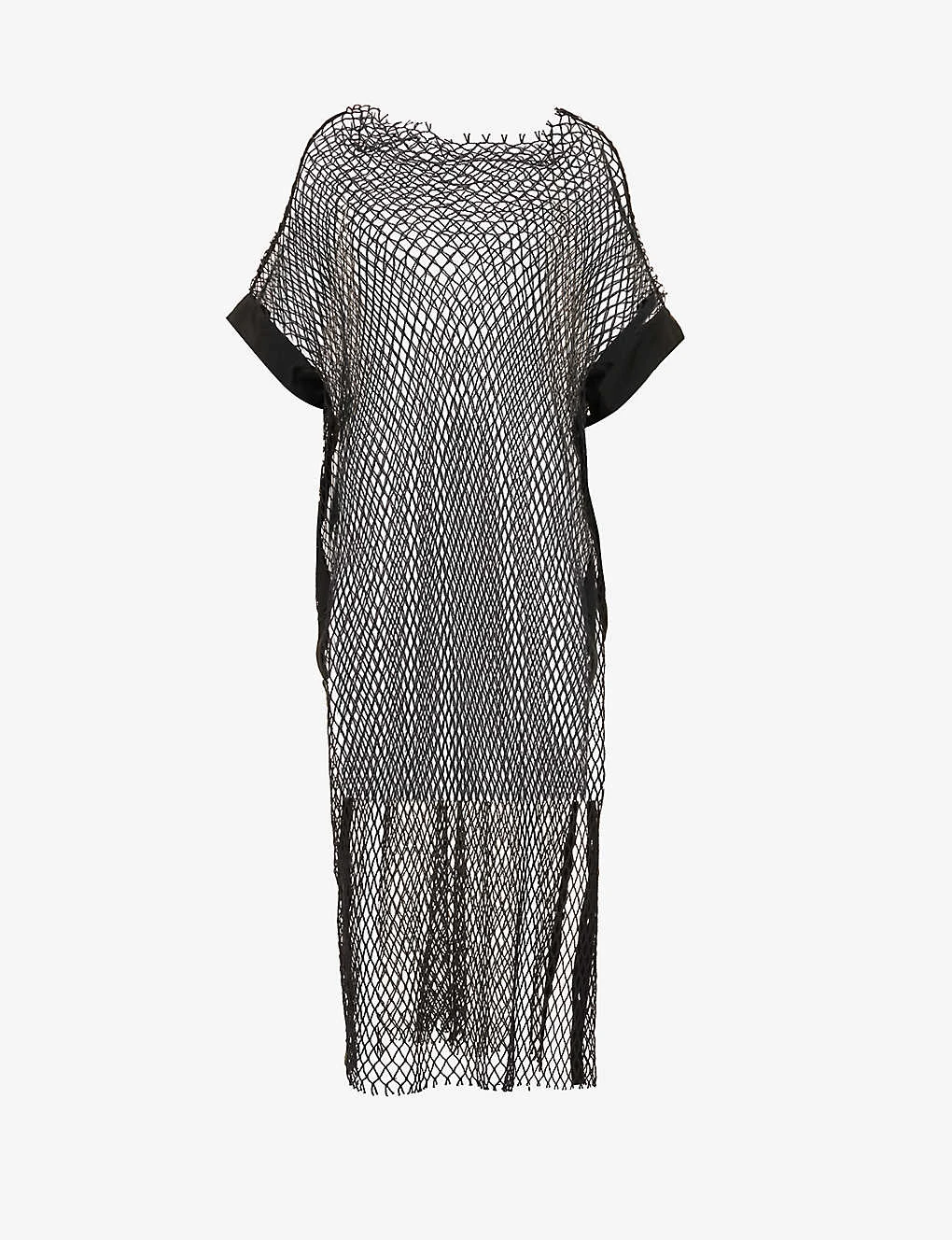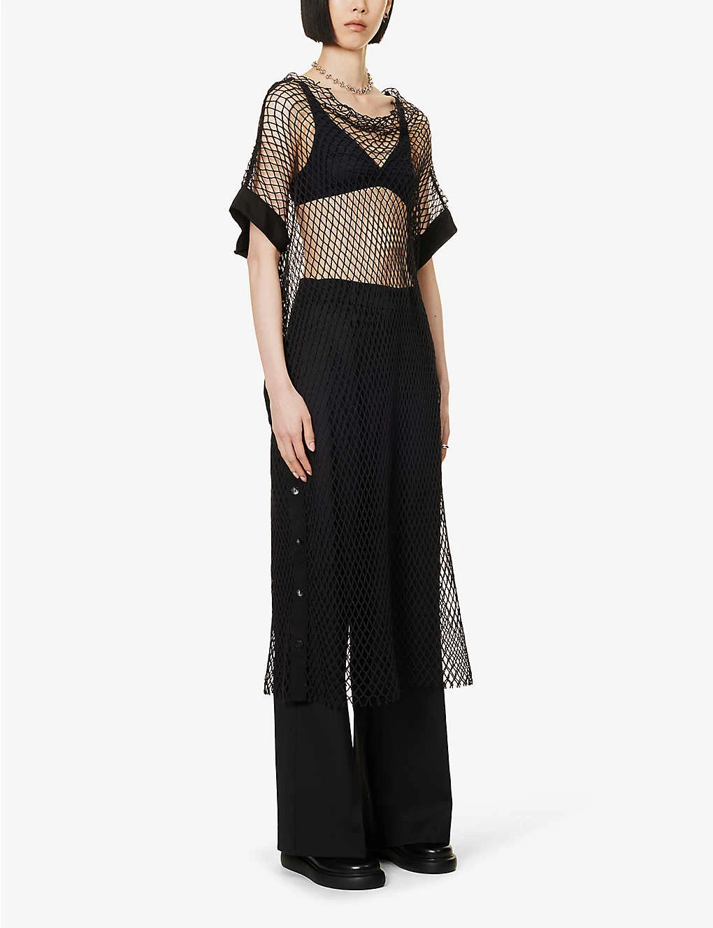 - Relaxed fit, cowl neckline, sleeveless, all-over net, button fastenings at sides, raw hem