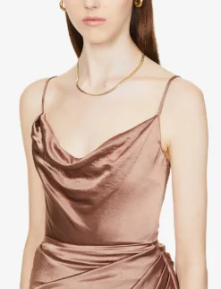 - Cowl neck, adjustable shoulder straps, corseted bodice, draped skirt, side split, fully lined