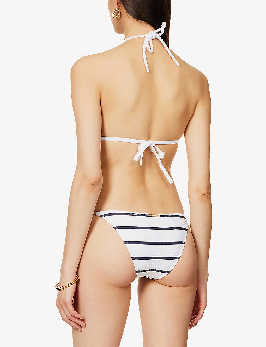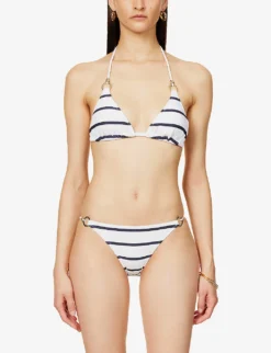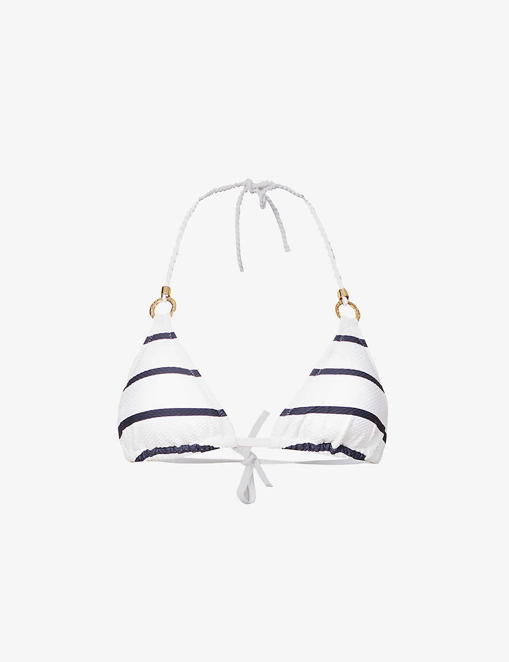 - Halterneck, soft triangle cups with removeable padding, all-over striped pattern and textured weave, gold-toned hardware, fully lined